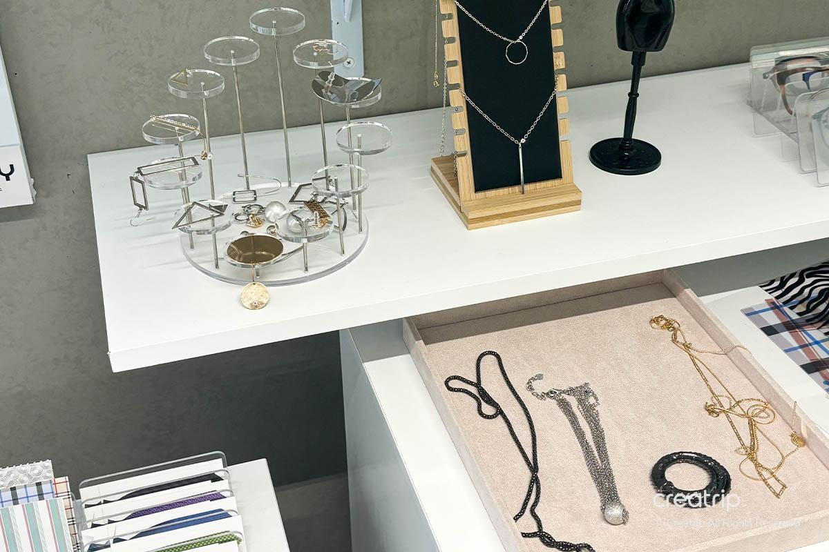 Kami juga mencoba anting-anting dan kalung. Dalam hal anting-anting, mereka memeriksa bentuk dan ukuran liontin secara detail untuk melihat jenis kalung apa yang cocok dengan ketebalan, bahan, dan panjang rantainya.