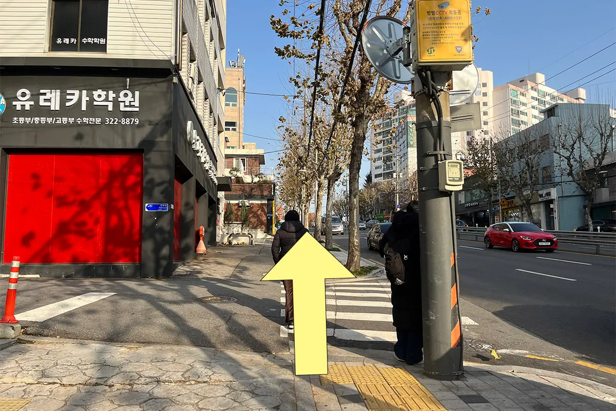 Ketika kamu mencapai persimpangan tiga, menyeberanglah di zebra cross di sebelah kiri.