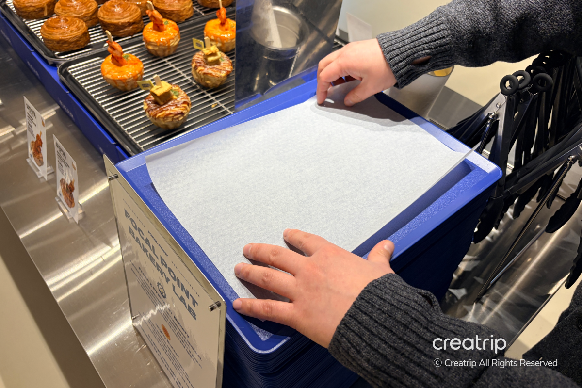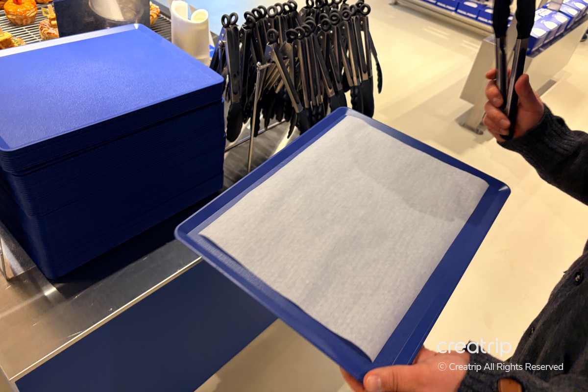 Letakkan kertas tahan minyak di atas nampan biru yang disediakan di toko, lalu gunakan penjepit untuk mengambil pai yang Anda inginkan sendiri.