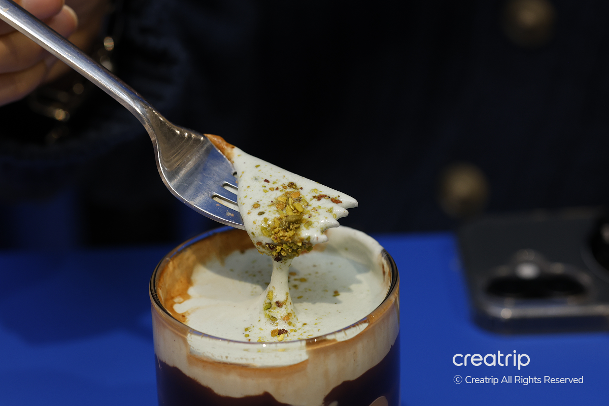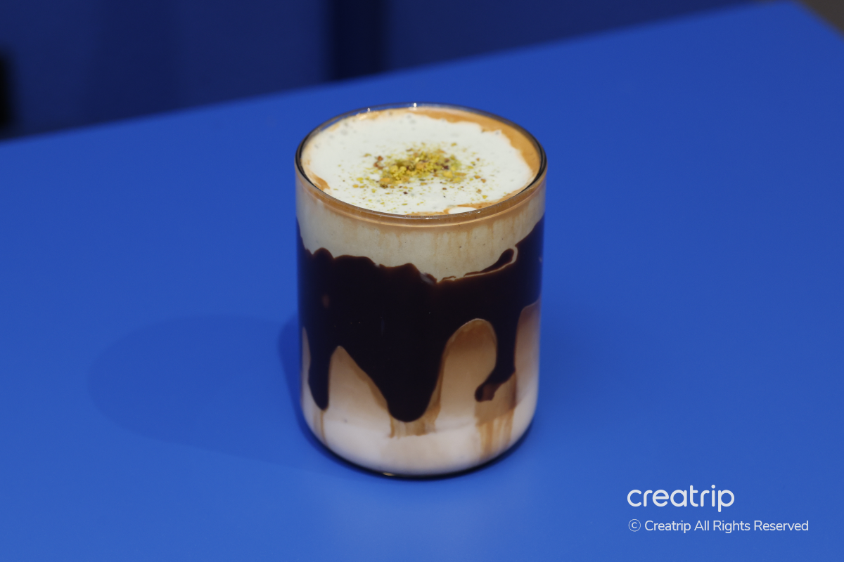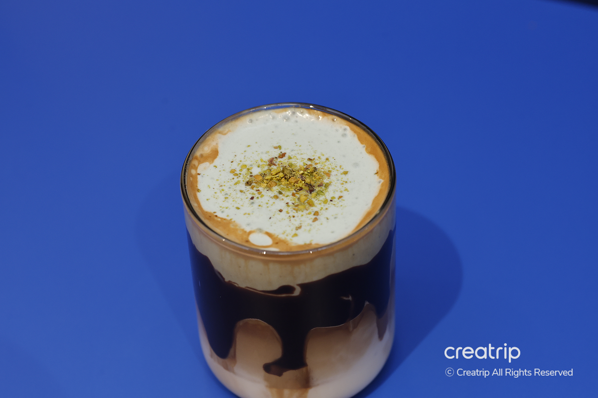 Sebuah menu yang diberi topping satu scoop besar krim pistachio di atas kopi pekat, krimnya tidak dimaksudkan untuk diminum melalui sedotan, Anda bisa mengambilnya dengan sendok atau membawa cangkir ke bibir dan menikmatinya bersama kopinya.