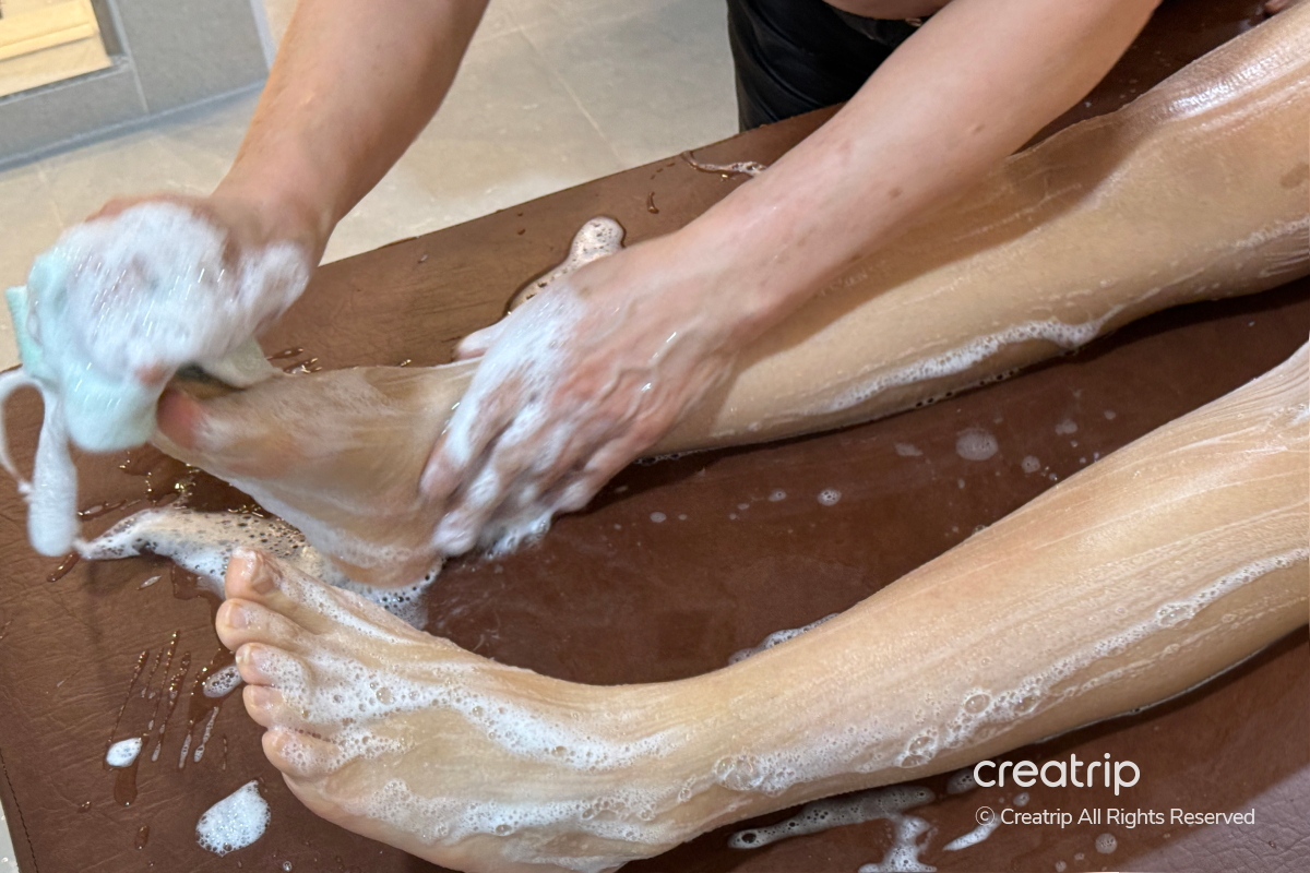 Sekarang sesi Sesin dimulai dengan serius, dimulai dari kaki dan bergerak ke seluruh tubuh untuk mengangkat sel kulit mati.