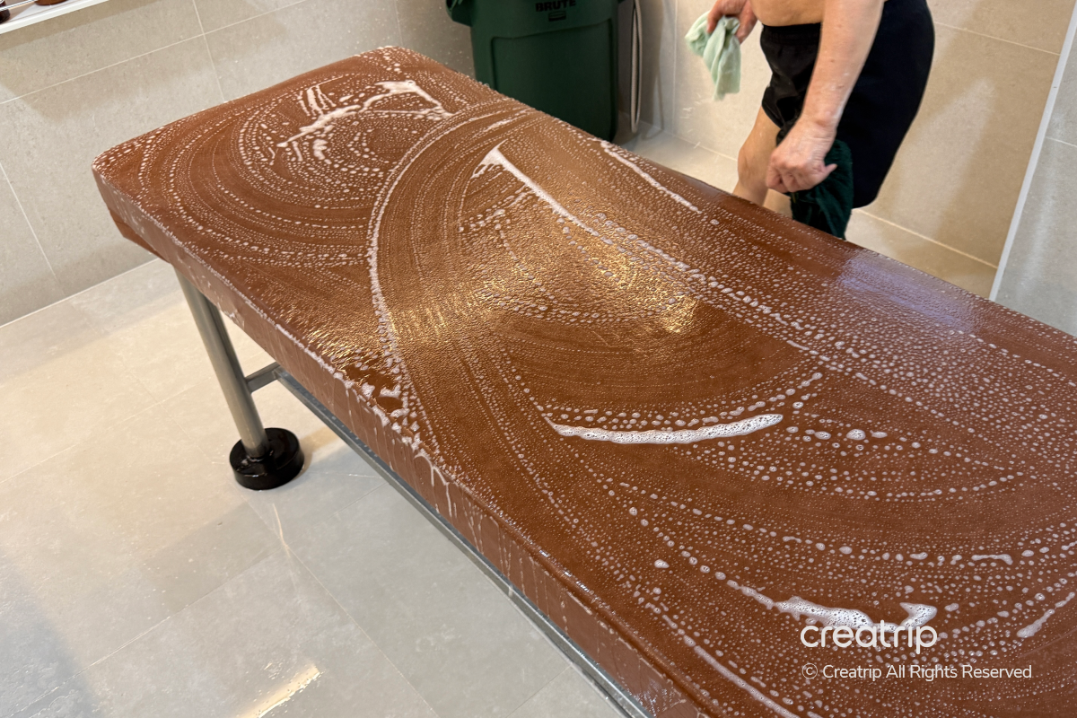 Setelah mandi, ketika Anda berbaring di meja Sesin, perawatan private body scrub resmi dimulai.