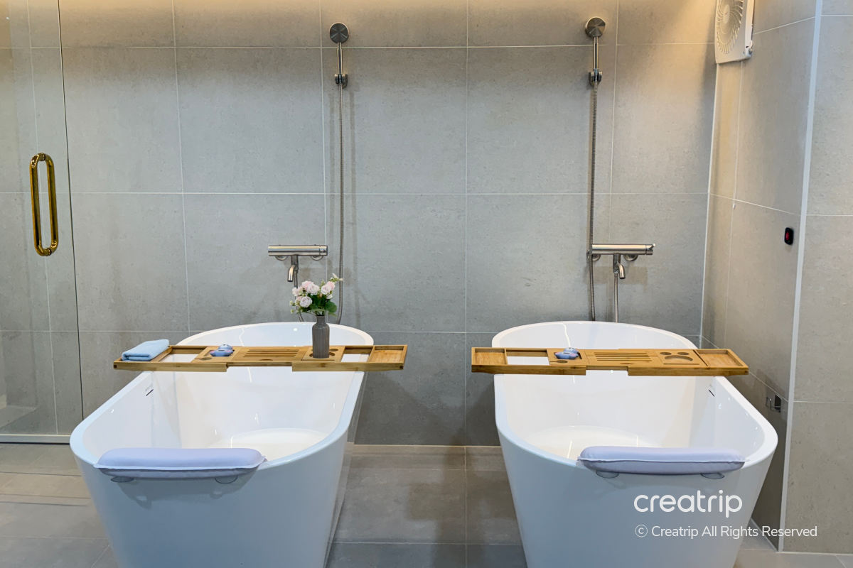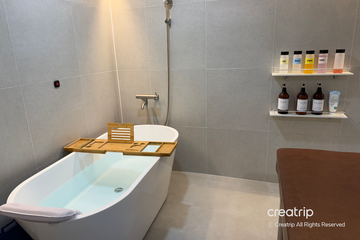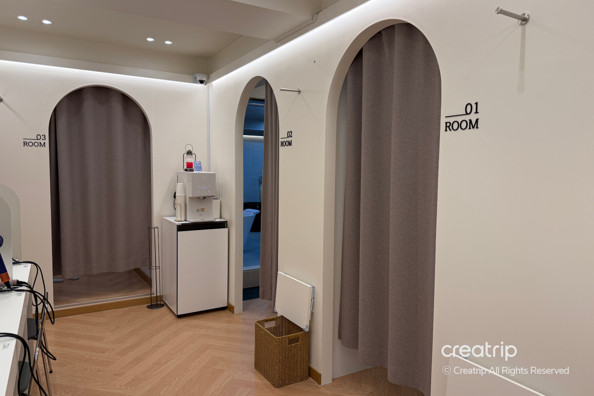 Bak mandi dan area perawatan disusun bersebelahan, jadi tampak cocok untuk datang bersama teman atau anggota keluarga dan menerima perawatan bersama.