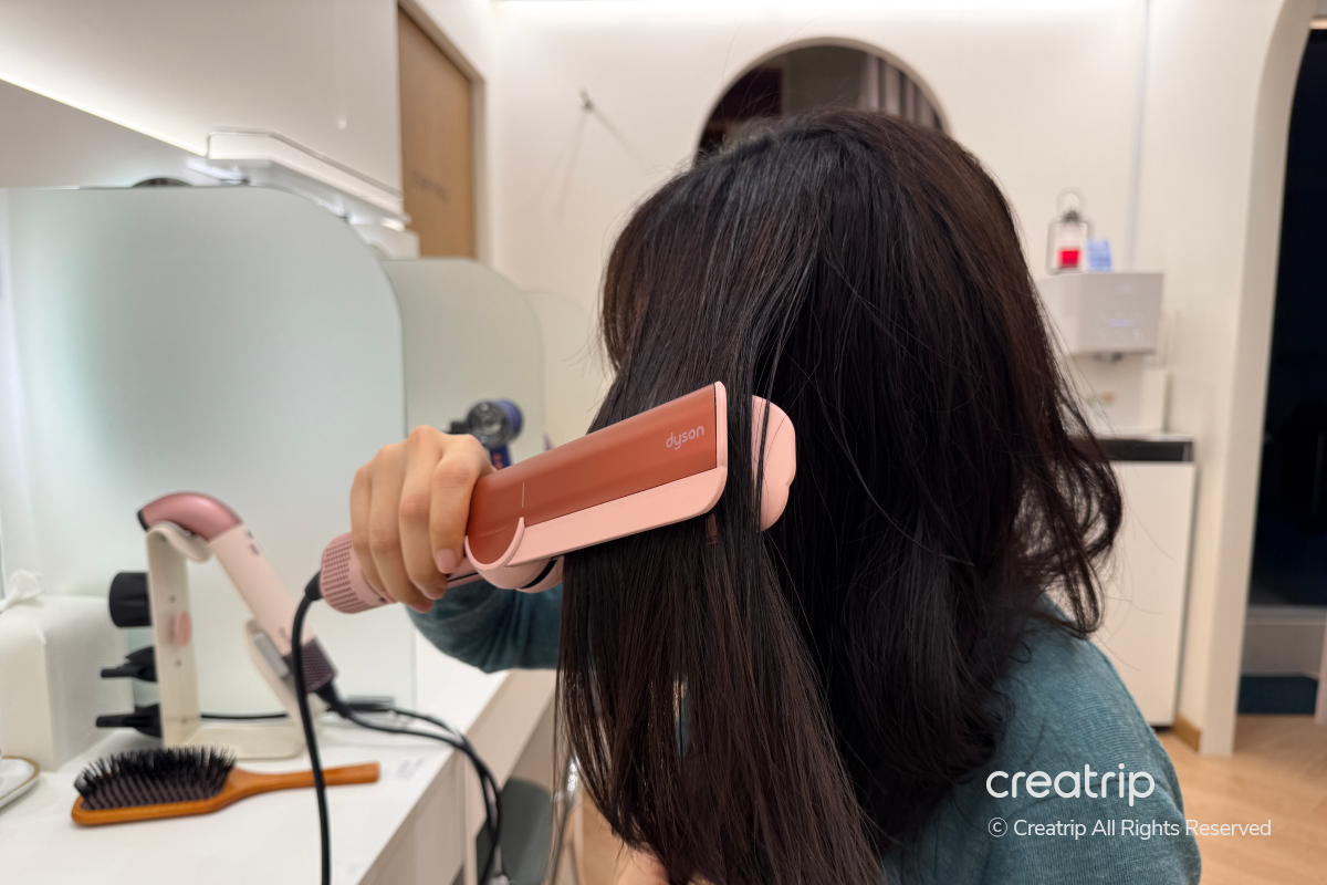 Editornya memakai berbagai pengering rambut dan alat styling Dyson untuk mengeringkan dan merapikan rambut, lalu menyelesaikan persiapan untuk pergi keluar.