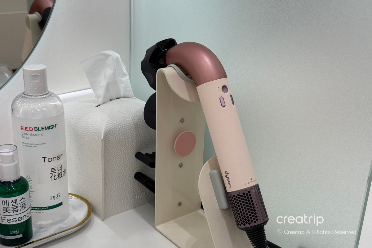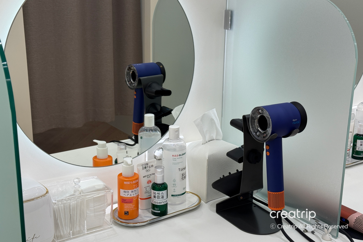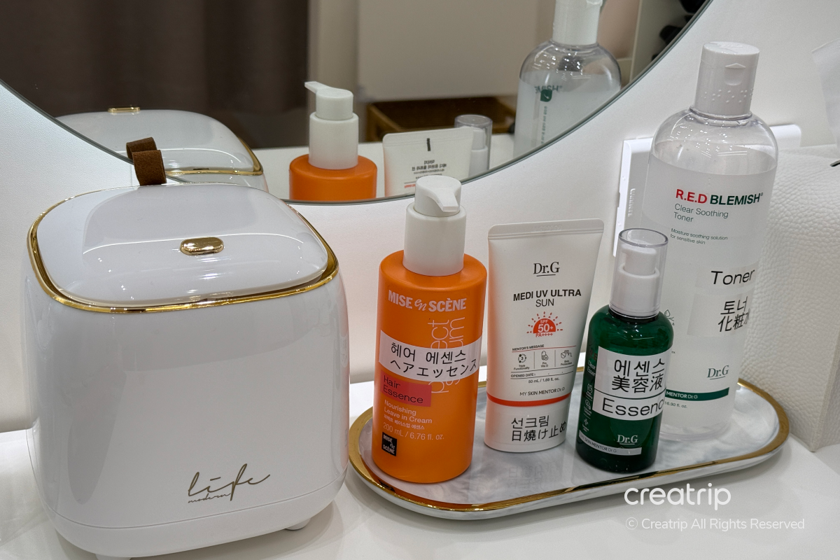 Selain itu, perlengkapan perawatan dasar seperti kapas, toner, essence, hair essence, dan tabir surya semuanya disediakan, jadi Anda bisa bersiap tanpa membawa barang tambahan.