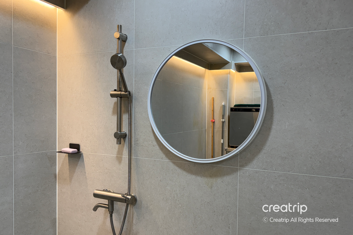 Editor kami menggunakan kamar tunggal, dan pengaturan mandi dipersiapkan rapi seperti ini.