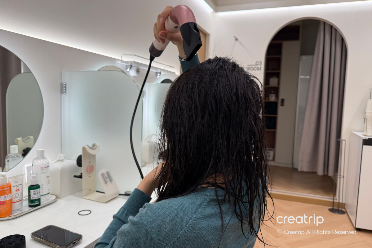 Setelah perawatan, Anda bisa mengeringkan dan merapikan rambut di ruang powder terpisah.