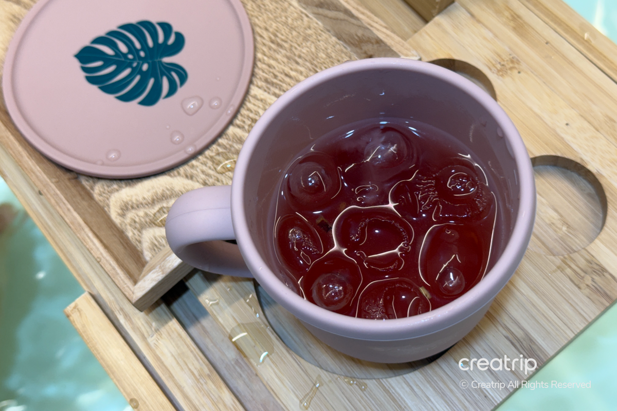 Produk mandi yang saya pilih sendiri diletakkan di bak, dan teh omija yang disertakan tersedia untuk diminum, jadi saya bisa bersantai dan menikmati saat mandi.