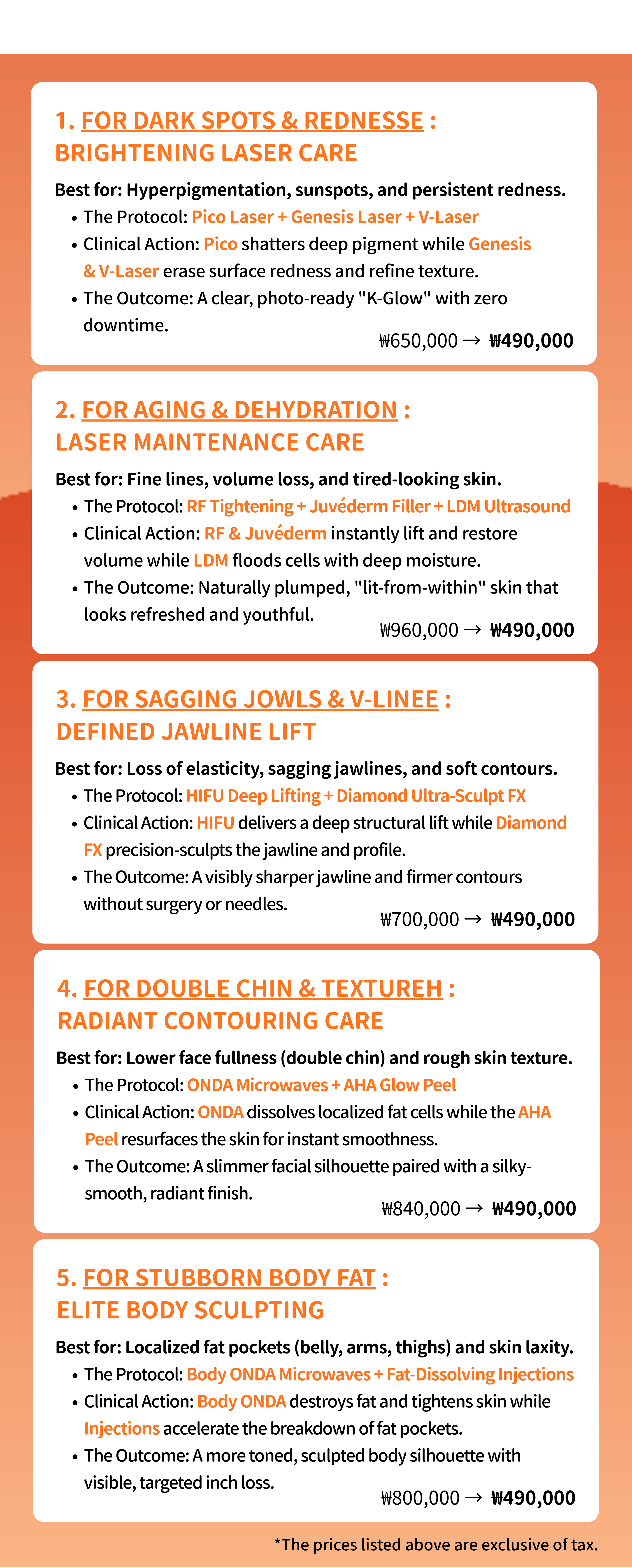 - Menggunakan peralatan mutakhir yang tepercaya: Shurink Universe, Ulthera Prime, Thermage, Inmode, Potenza, Fotona Laser.