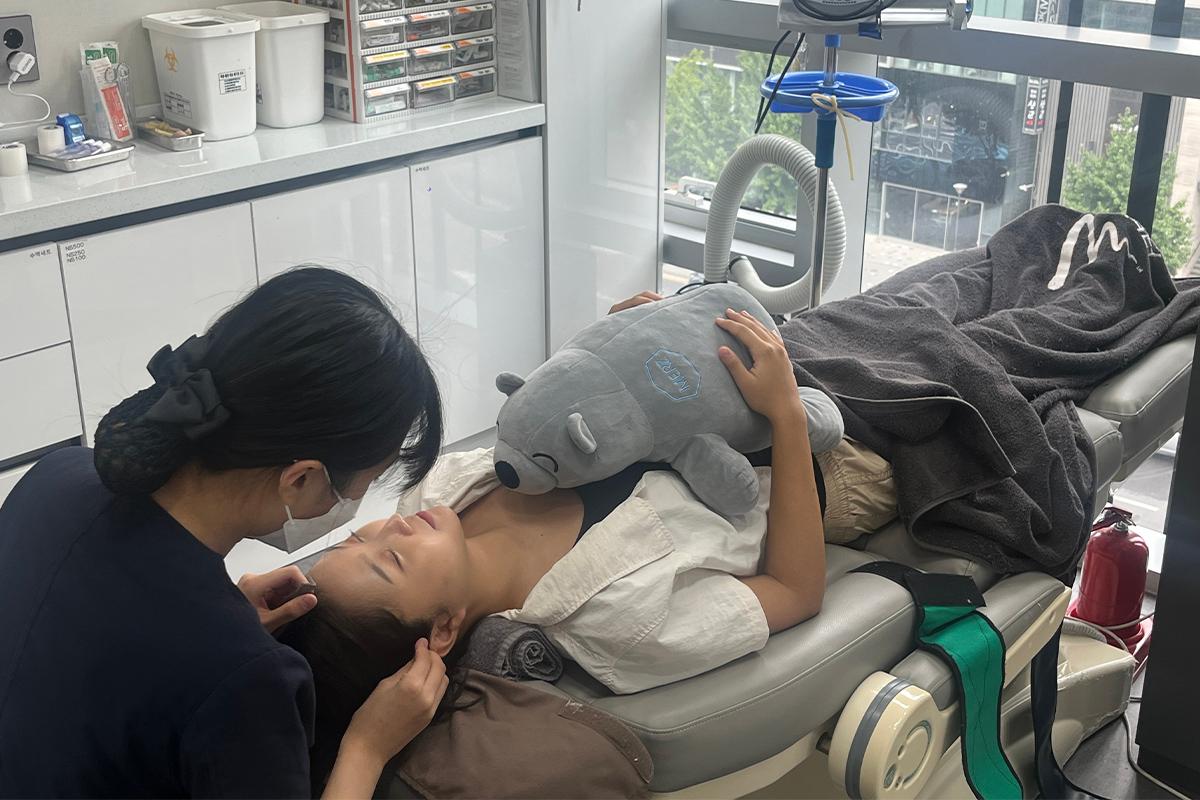 Una volta che sei nella stanza e seduto, verrà posizionato un asciugamano intorno alla testa. Inoltre, ti verrà fornito un cuscino più grande simile a una bambola che puoi tenere durante la procedura. Questo cuscino può offrire un notevole comfort se provi qualsiasi disagio.