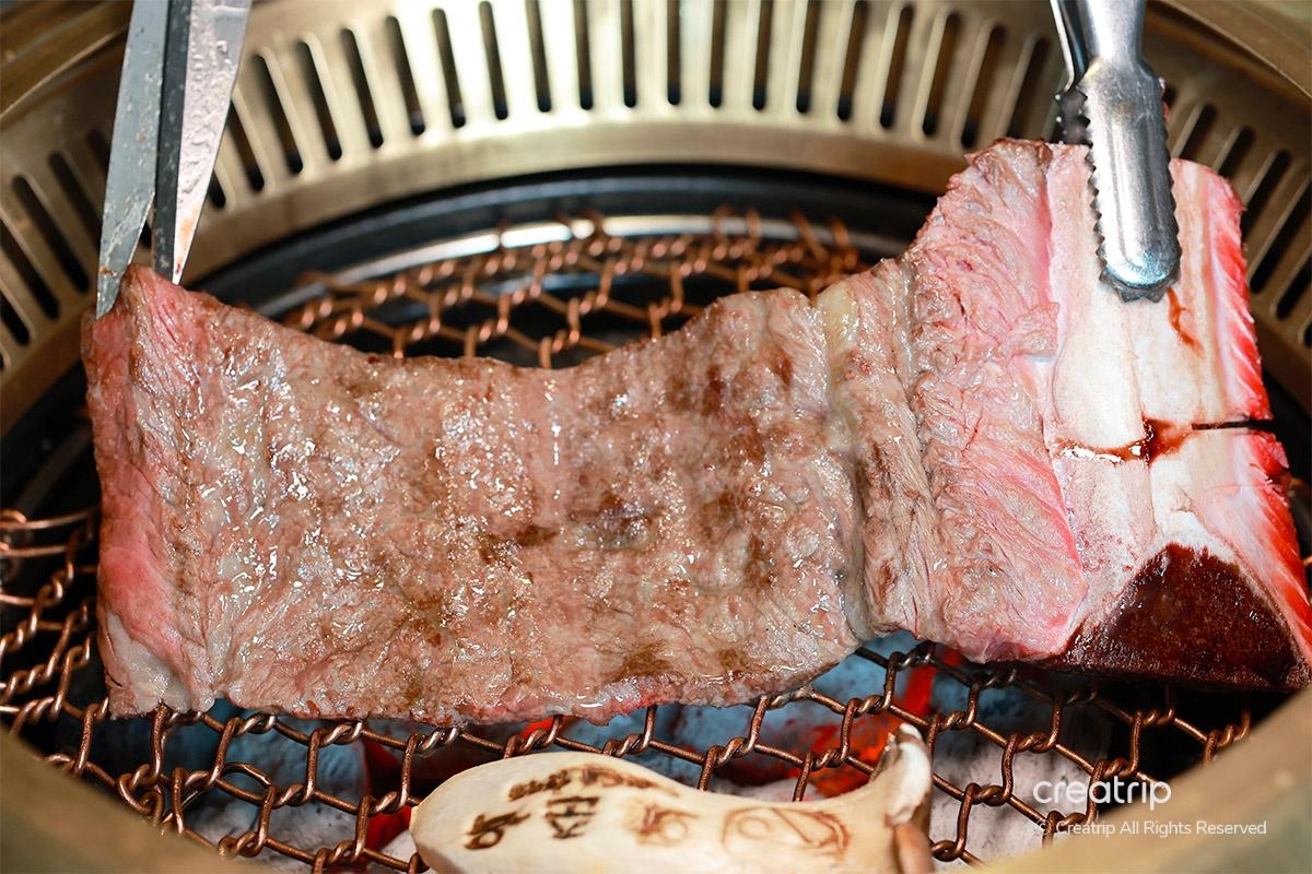 A Hwachunok, grigliano le costole fino all'85% sulla griglia, quindi usano il calore residuo del mini grill per finire la cottura. Mantengono la temperatura sul mini grill in modo che la carne non si raffreddi, quindi puoi gustarla calda fino all'ultima boccata.