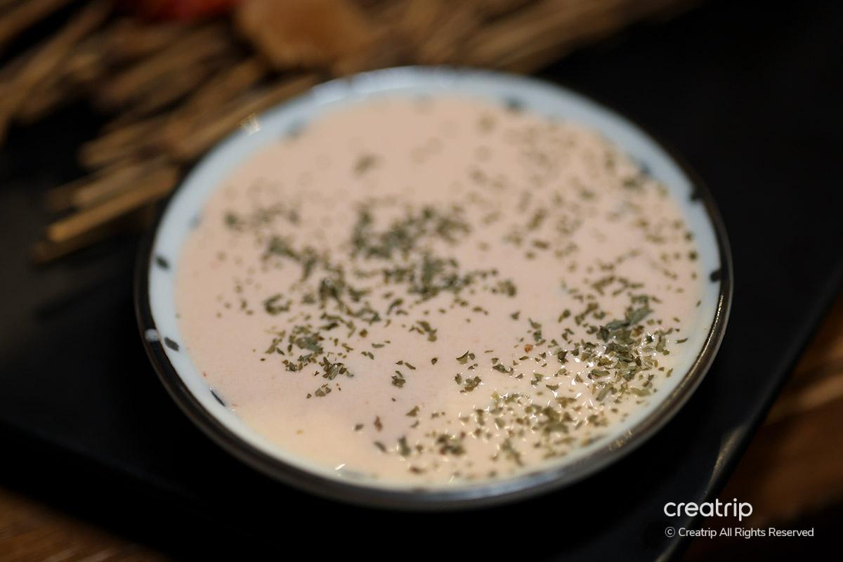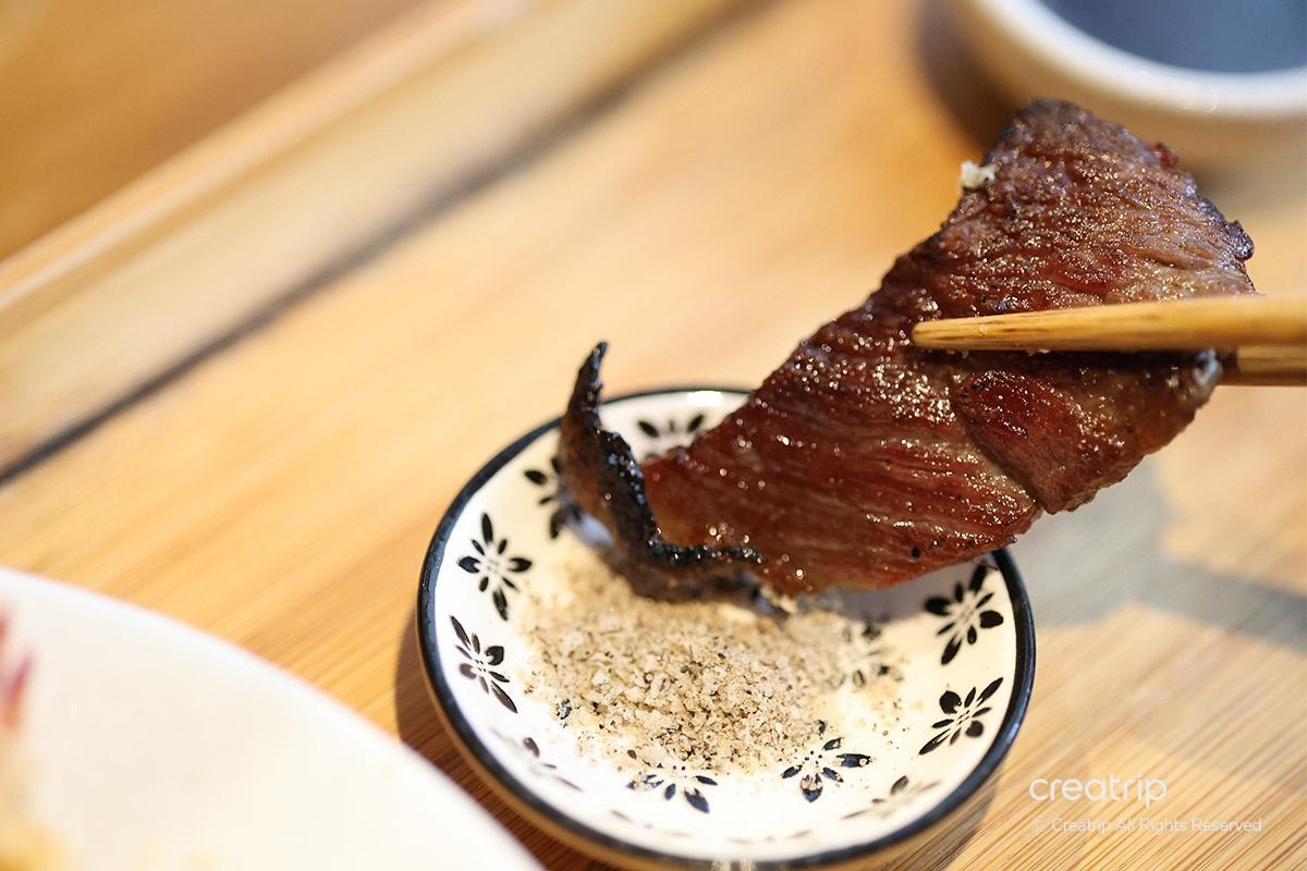 La carne cotta dovrebbe essere immersa in una salsa speciale secondo il tuo gusto. La salsa fornita viene preparata direttamente nel negozio, quindi puoi gustare il sapore dolce. La carne è di ottima qualità e spessa, quindi puoi sentire il pieno sapore della carne in bocca.