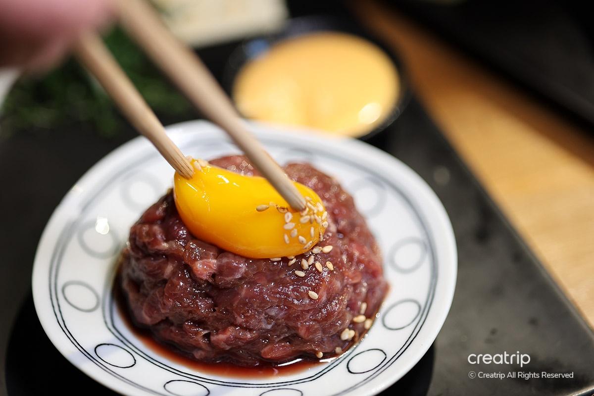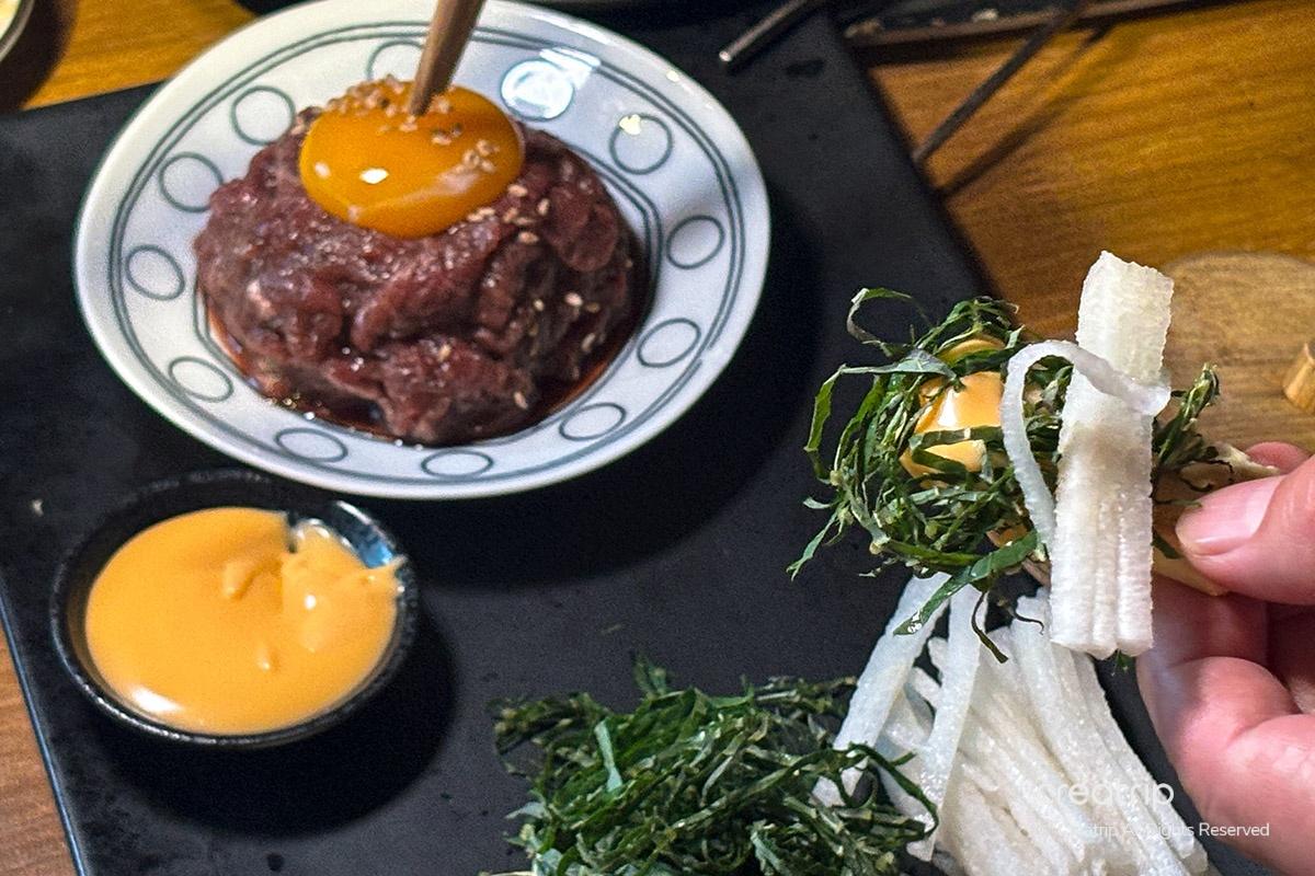 Assaggia yukhoe fresco, yukhoe mulhoe, zuppa di doenjang, uovo alla coque con bomba di formaggio, pollo karaage e tempura di gamberi reale.