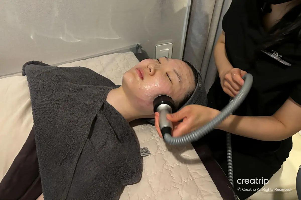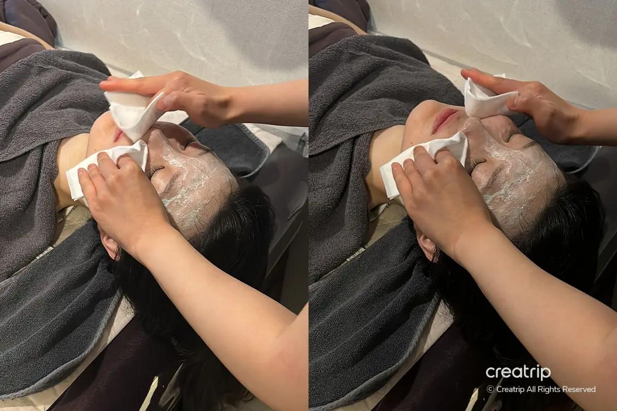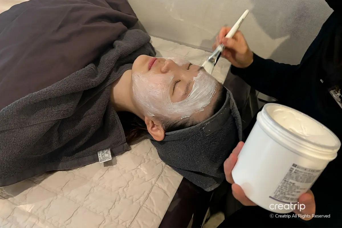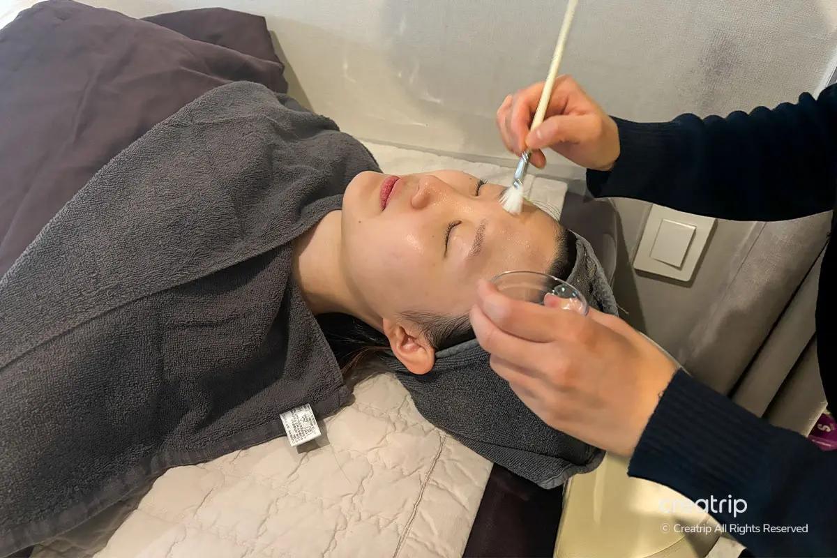 La visita è iniziata con il check-in alla reception usando il passaporto per la conferma della prenotazione, seguito da una detersione approfondita in un'area di preparazione dedicata fornita di prodotti professionali, inclusi struccante per labbra/occhi e detergenti schiumogeni. Sono inoltre disponibili servizi post-trattamento come pettini e una piastra Dyson.