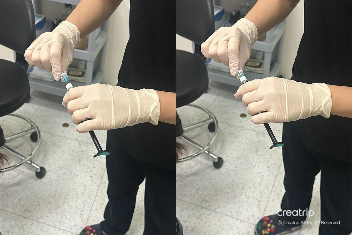 L'iniezione di Rejuran Healer è stata eseguita a seguire. Prima dell'iniezione è stato confermato con il paziente che il farmaco era autentico. Sebbene Rejuran preveda necessariamente il contatto dell'ago con lo strato dermico, l'ago microneedle da 2 mm e il sistema 4D pain care hanno mantenuto il disagio ben entro una soglia gestibile. La rapidità e la precisione del Dr. Lee hanno ulteriormente ridotto al minimo l'esperienza.