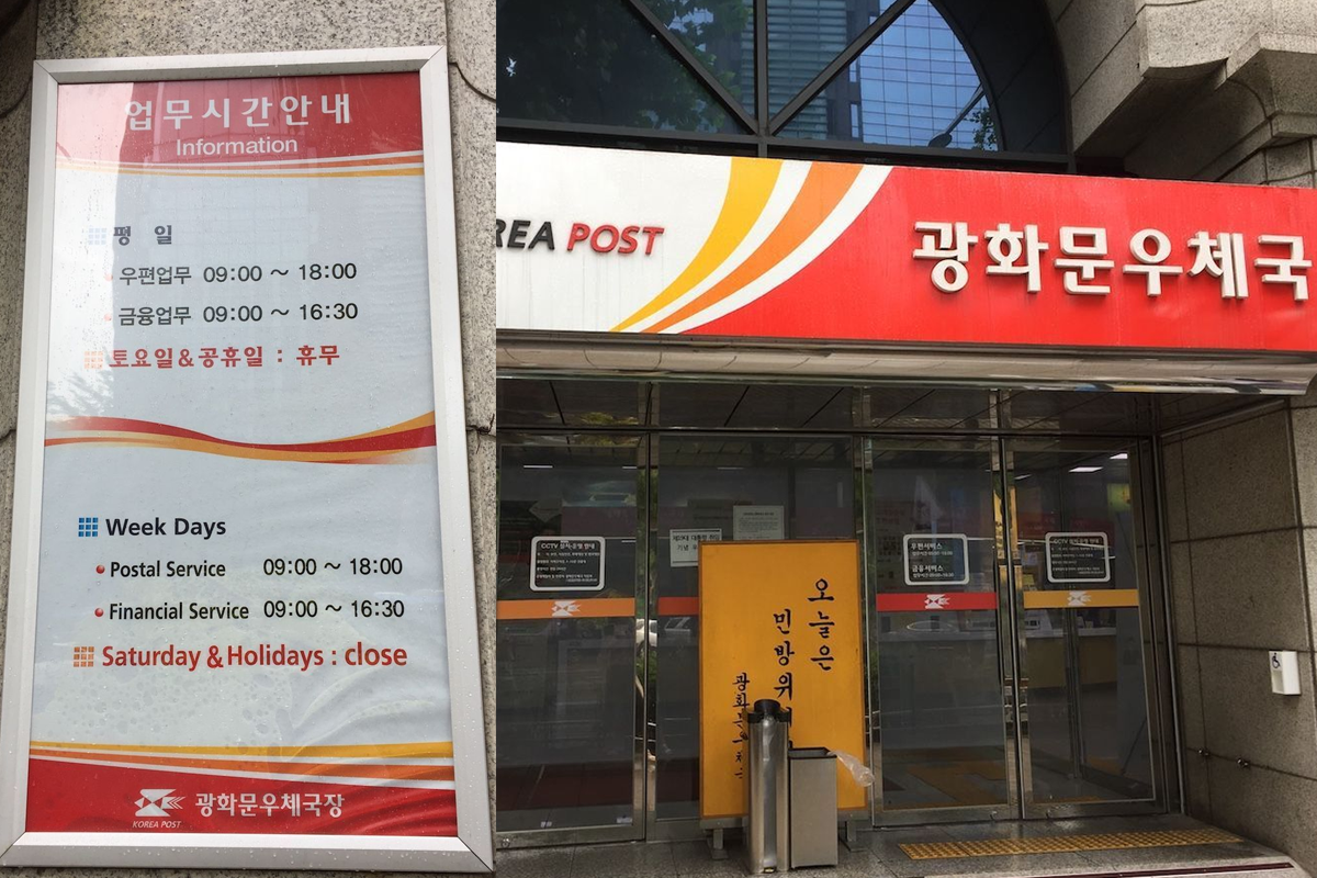 Gli orari di apertura per inviare un pacco presso l'ufficio postale della Corea sono solitamente dalle 09:00 alle 16:30. Ogni ufficio postale potrebbe avere orari diversi, ma per essere sicuri, arrivare almeno entro le 16:00. L'ufficio postale è chiuso nei fine settimana e nei giorni festivi nazionali.