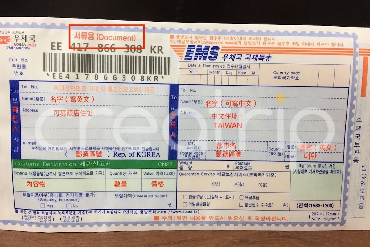 Per inviare un pacco dalla Corea, sarà necessario compilare un indirizzo di ritorno. Se non vivi in Corea, scrivi l'indirizzo del tuo hotel o l'indirizzo di un amico che vive in Corea in coreano o inglese.