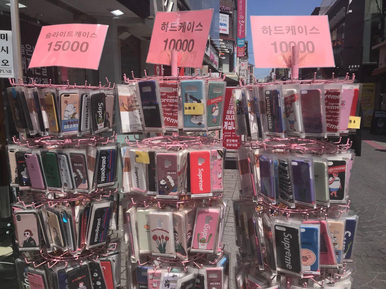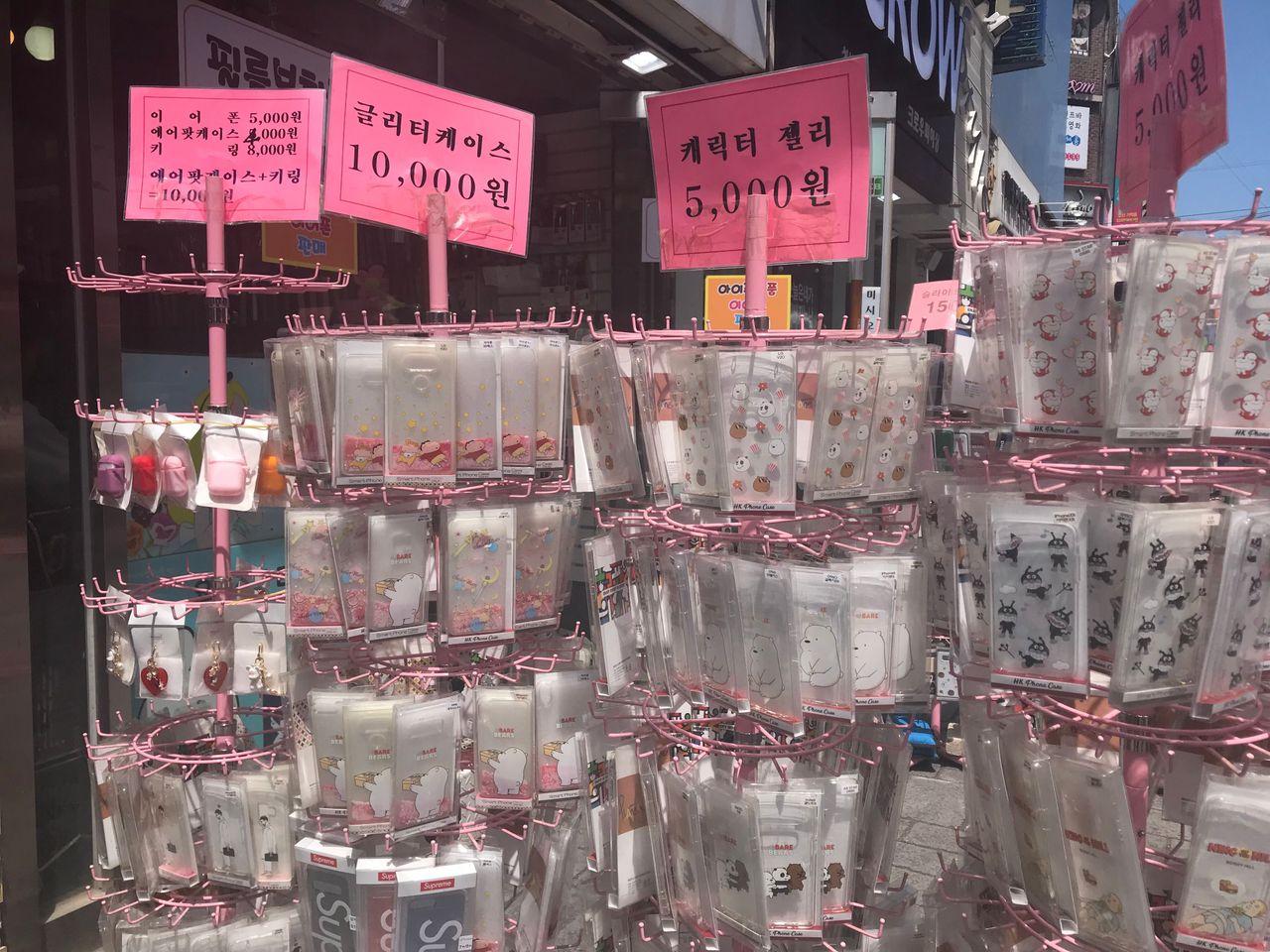 C'è anche una piccola area dove puoi comprare custodie per telefoni carine. Molte persone che vengono in Corea vogliono comprare custodie per cellulari, ed eccole qui!