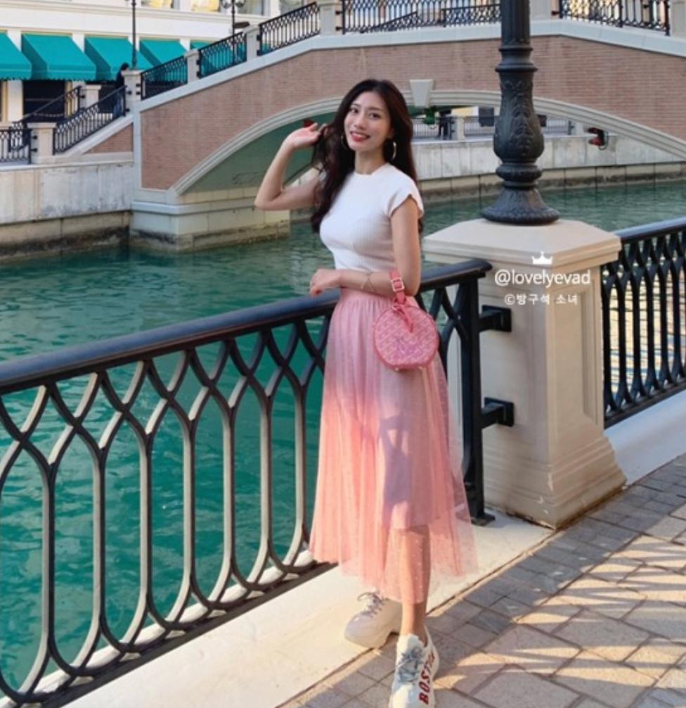 Sull'outfit casual di Son Dam-bi, la borsa Flap PANINI rossa con il suo vistoso manico di pelliccia carino ha aggiunto un tocco alla sua moda.