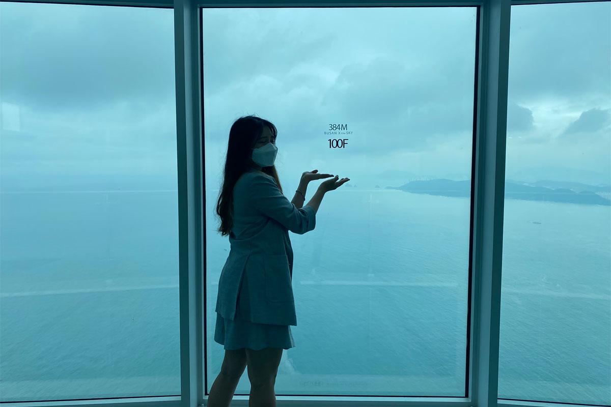 海雲台のビーチ沿いにある建物「エルシティ・ランドマークタワー」に位置し、標高411.6メートルになる100階展望フロアからは、釜山の海や山、マンション群が一望できるとオープン直後から話題沸騰でした