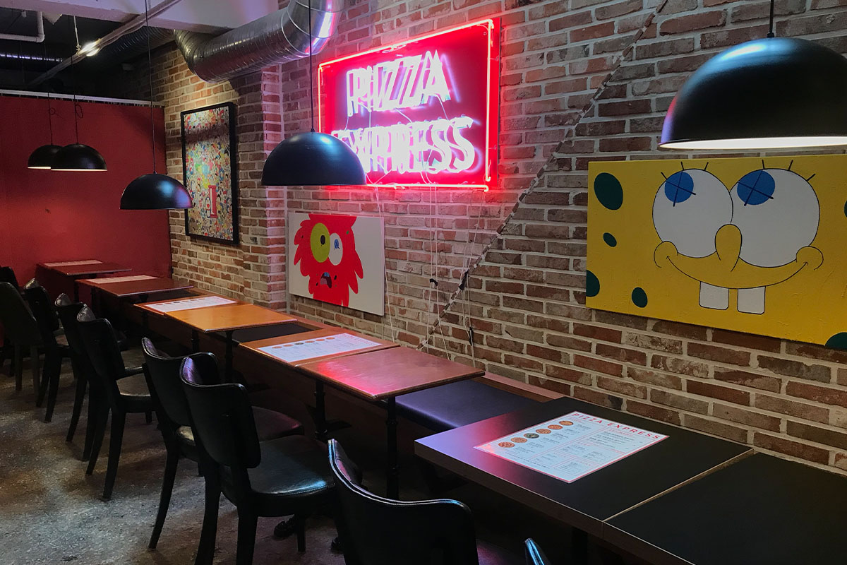 店内はピザのパッケージやスケートボードでストリートスタイルに飾られていました