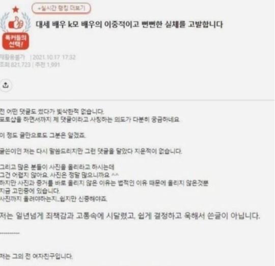 一方、去る17日、あるオンラインコミュニティには、「売れっ子俳優K某俳優の二重的で厚かましい実体を告発します」というタイトルの書き込みが掲載された。