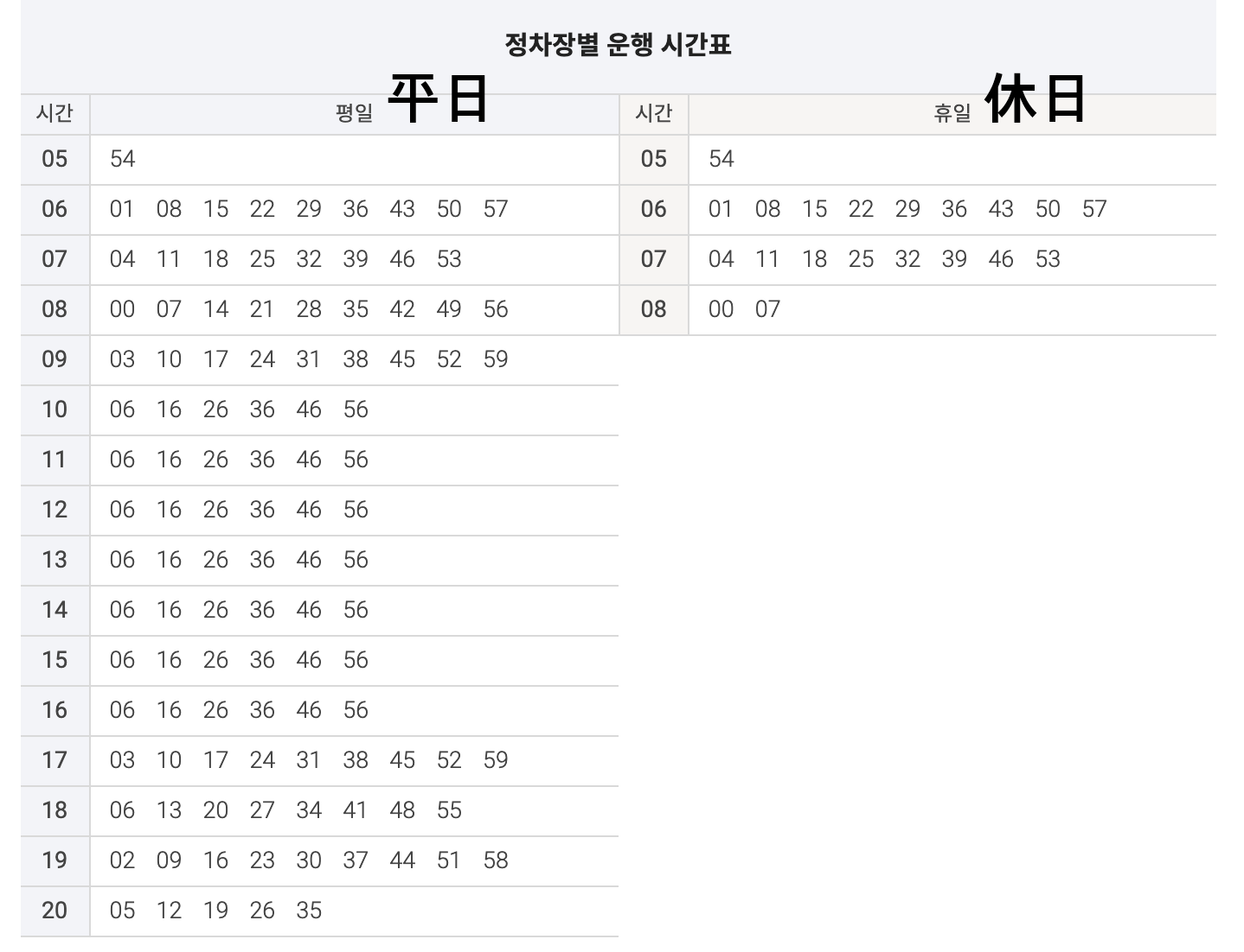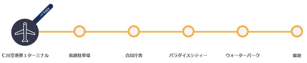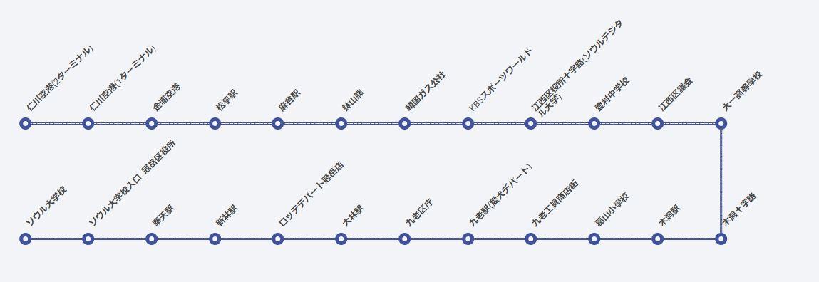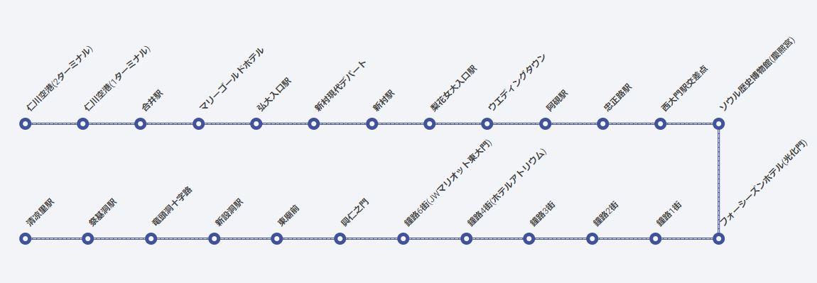 | 仁川空港T2発 | 仁川空港T1 | 金浦空港 | 弘大駅 | ソウル駅着 |