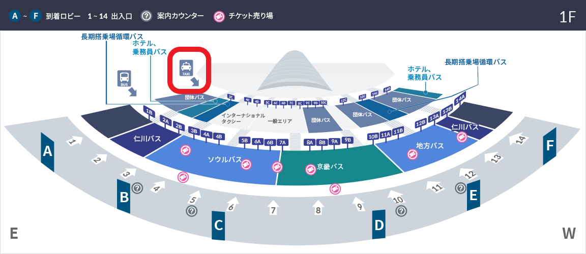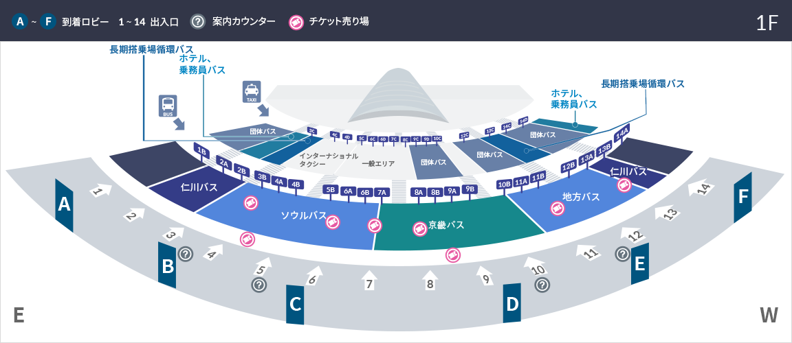 空港高速バスのチケット売り場は、1階の4、6~9、11、13番出口付近にあります。(写真のピンクの表示)