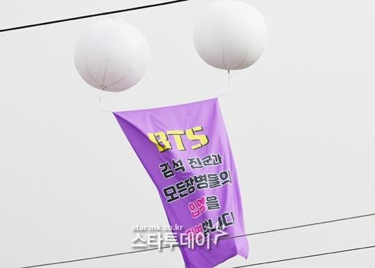 ただし、ジンが元気に軍服務を終えてくることを願うARMYたちの気持ちは、垂れ幕とアドバルーンなどで伝えられた。