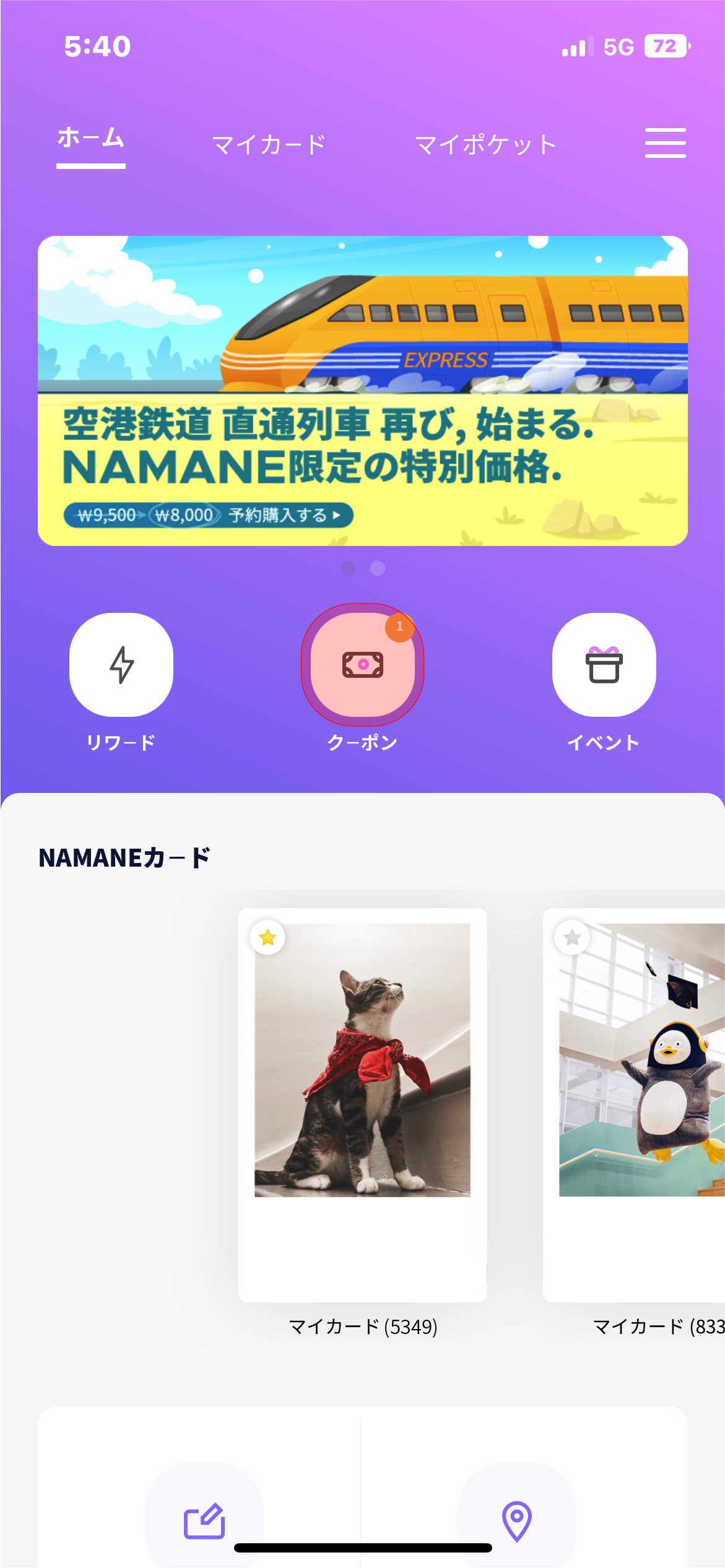 - NAMNEカードは韓国のカード会社「KB国民カード」網を使用する韓国カードです。 韓国到着後、近くにあるキオスクで実物カードとして発行してください。