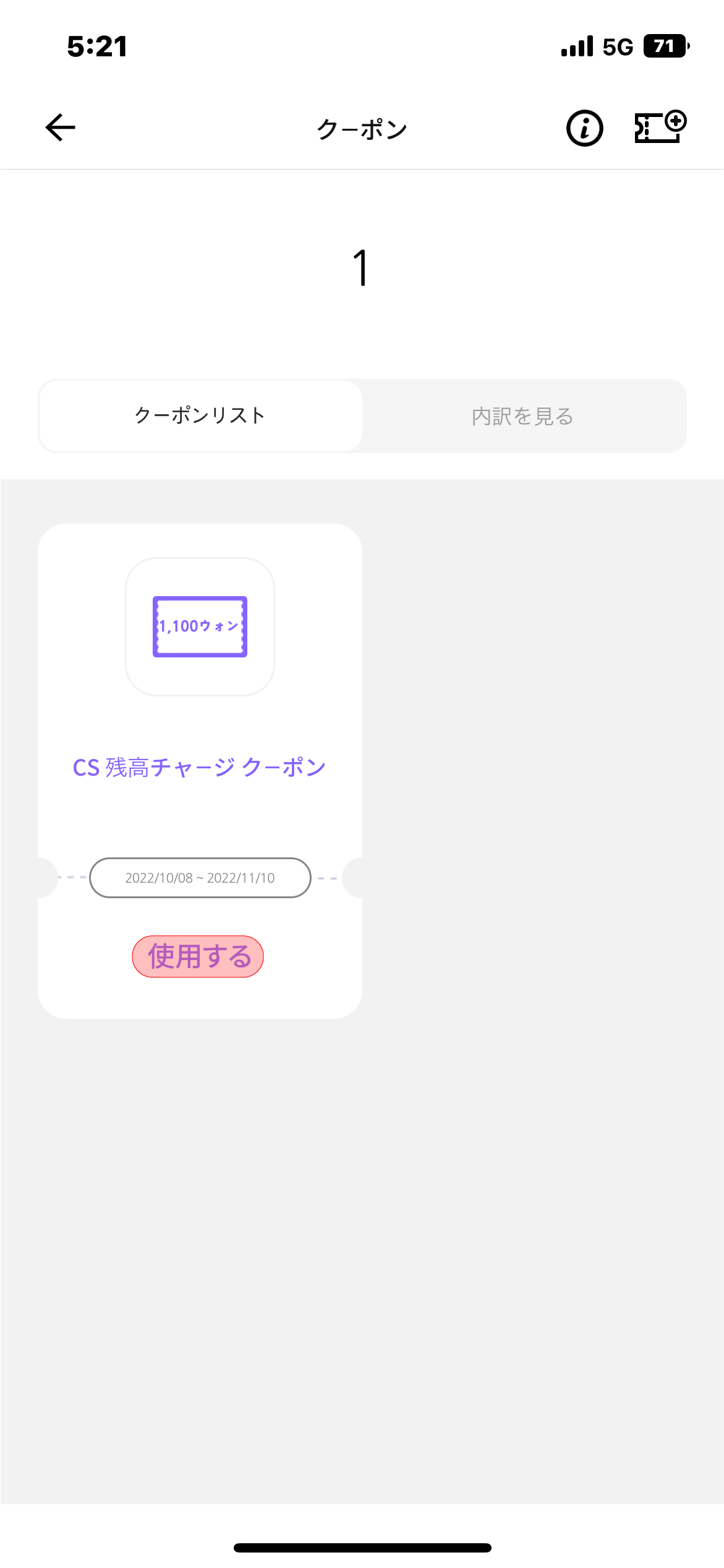 Step 4 | クーポンが登録されたらすぐにチャージが可能です。 チャージするには [ 使用する] を押します。 |