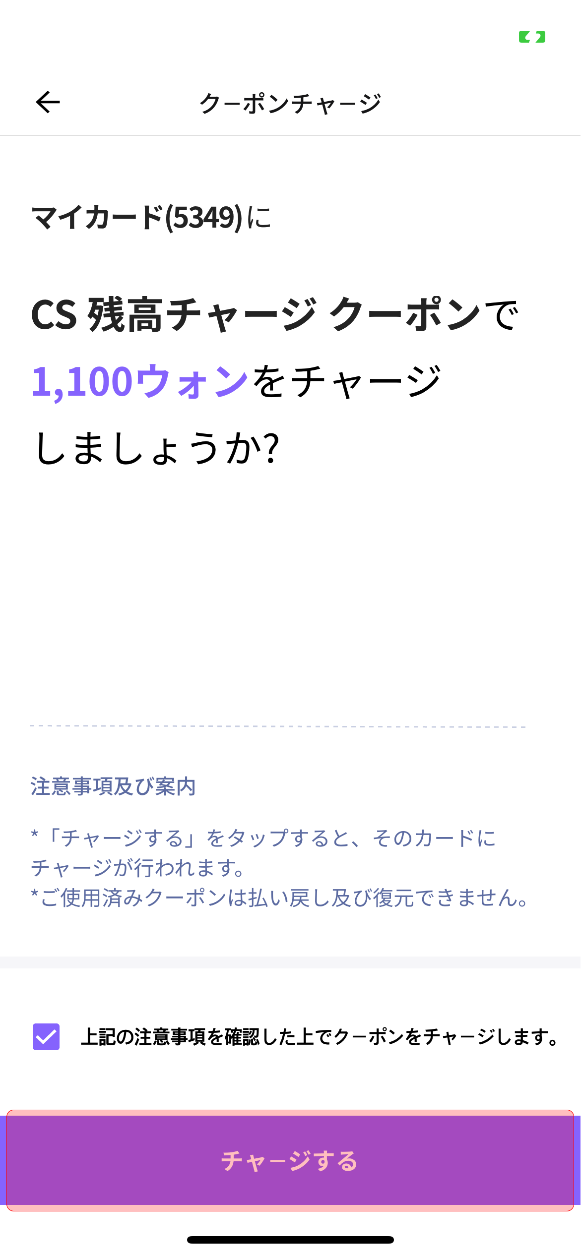 Step 6 | 注意事項を確認したらチェックを入れて、[チャージする] を押すとチャージ完了! |
