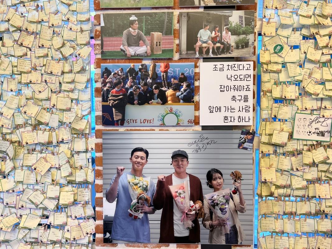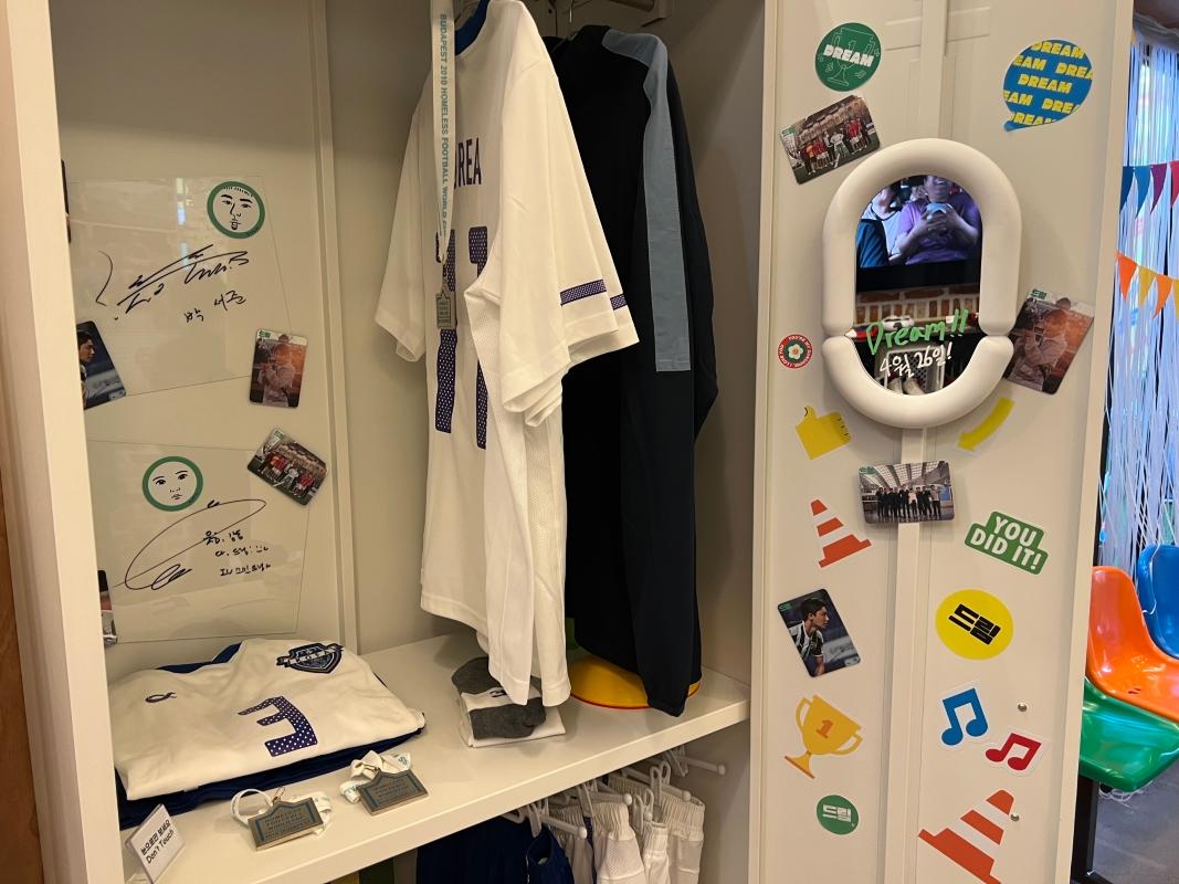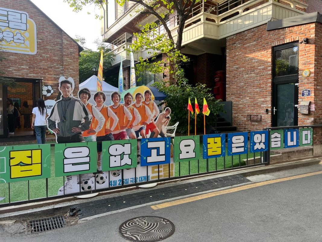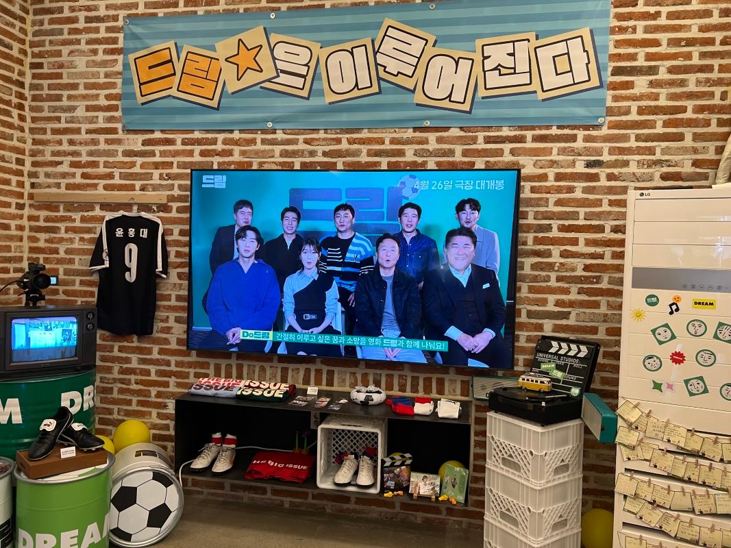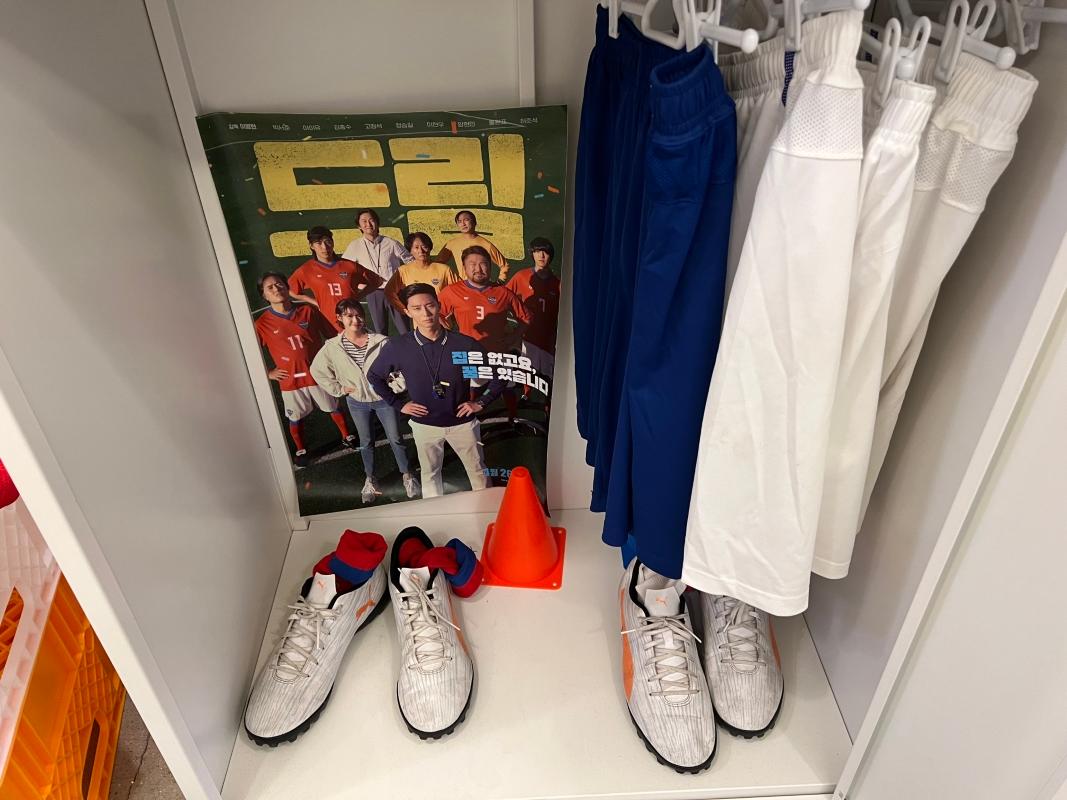 入り口を入ると、まず野外に俳優たちのパネルやサッカーと関連するアイテムが展示されていました!