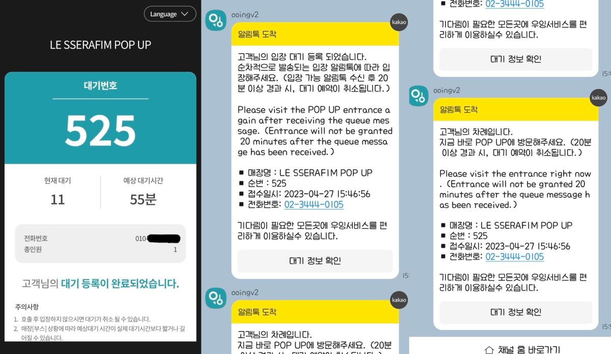電話番号を登録すると、このようにカカオトークで待ち時間を確認できます。