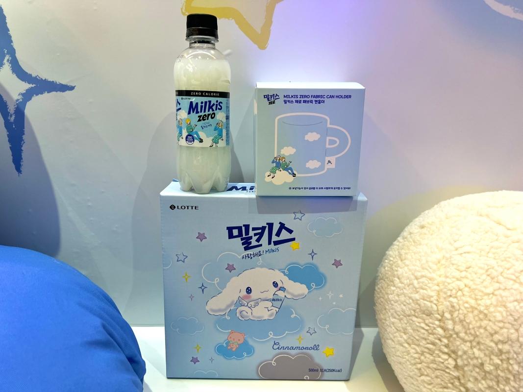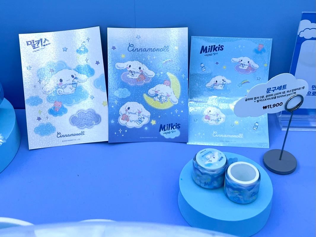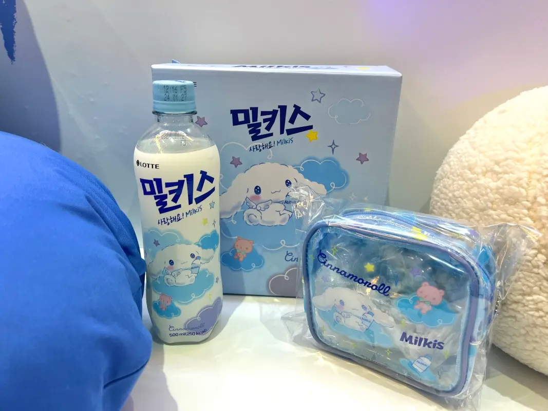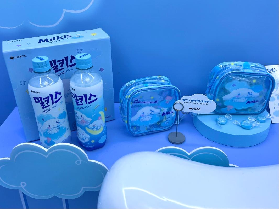 Milkisとシナモロールのコラボ商品が展示されている様子です。かわいいパッケージが特徴的です。