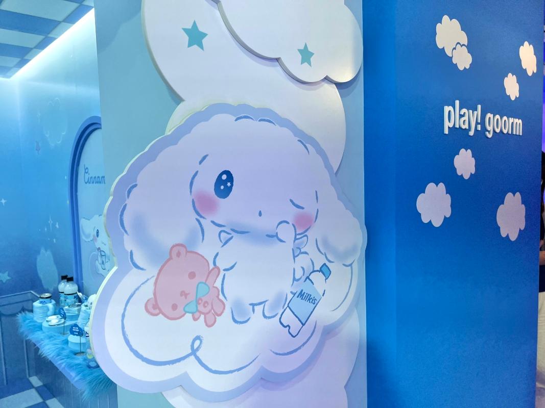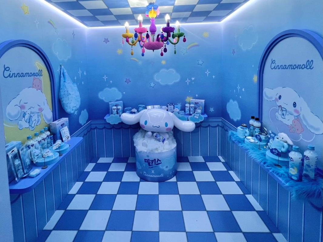 建物内に設けられた複数のフォトゾーン。可愛いシナモロールとMilkisの商品が展示されており、撮影に最適な場所です。