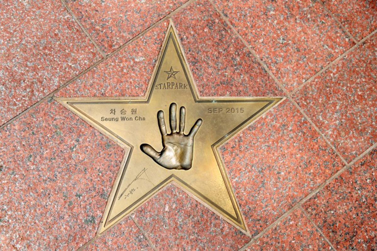 野外広場にいる有名なオブジェや床にある芸能人の手形など見どころがいっぱいです