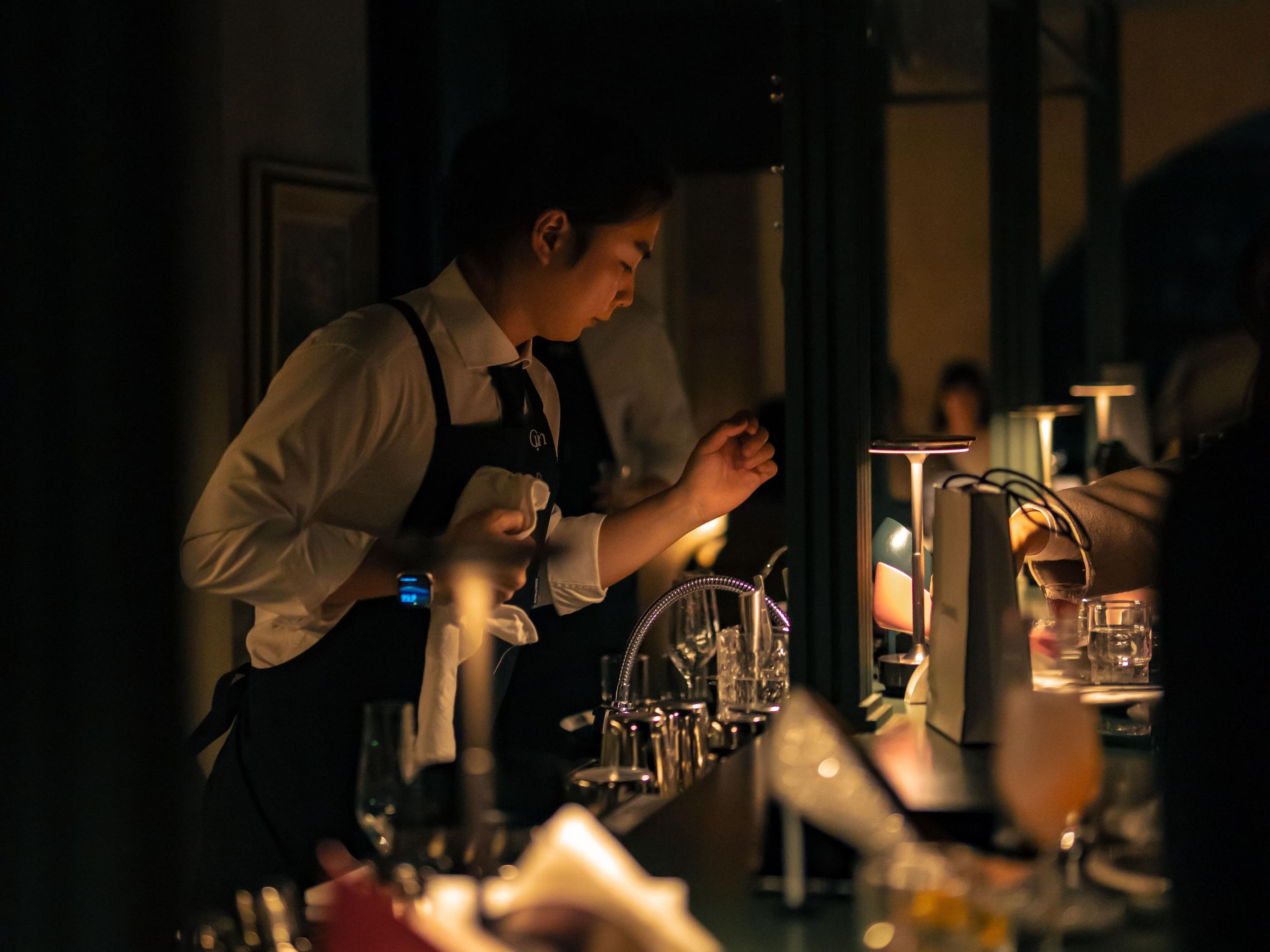 カクテルを作る様子を目の前で見ることのできるバーテーブルと、大きな窓越しに外の風景を眺めながら食事が楽しめるテーブル席に分かれています。