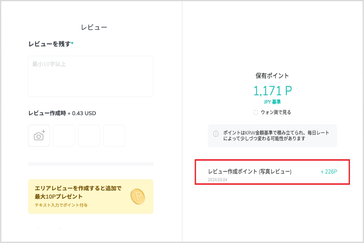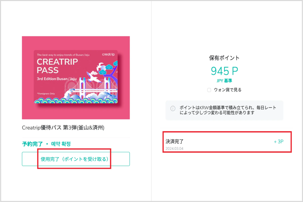 予約ポイントは、マイページから使用済み商品の「使用完了」ボタンを押すと、決済金額の1%が付与されます。(例:1,050ウォンの支払い → 10.5P → 10P付与)