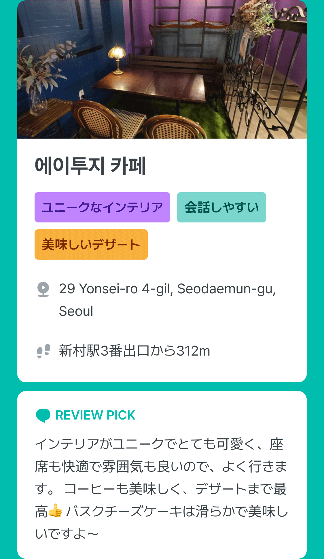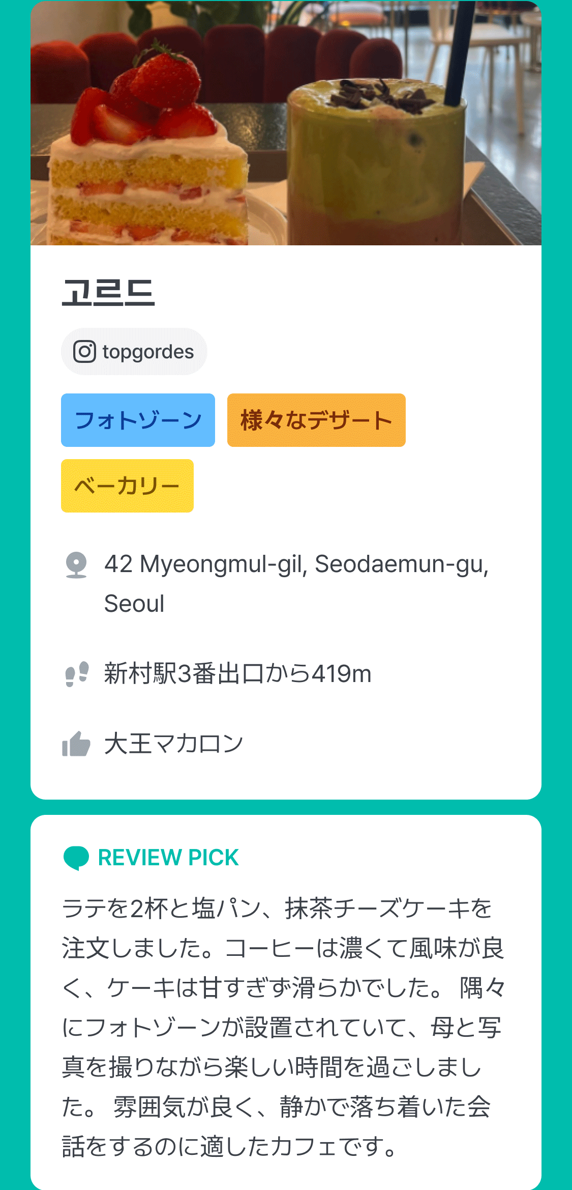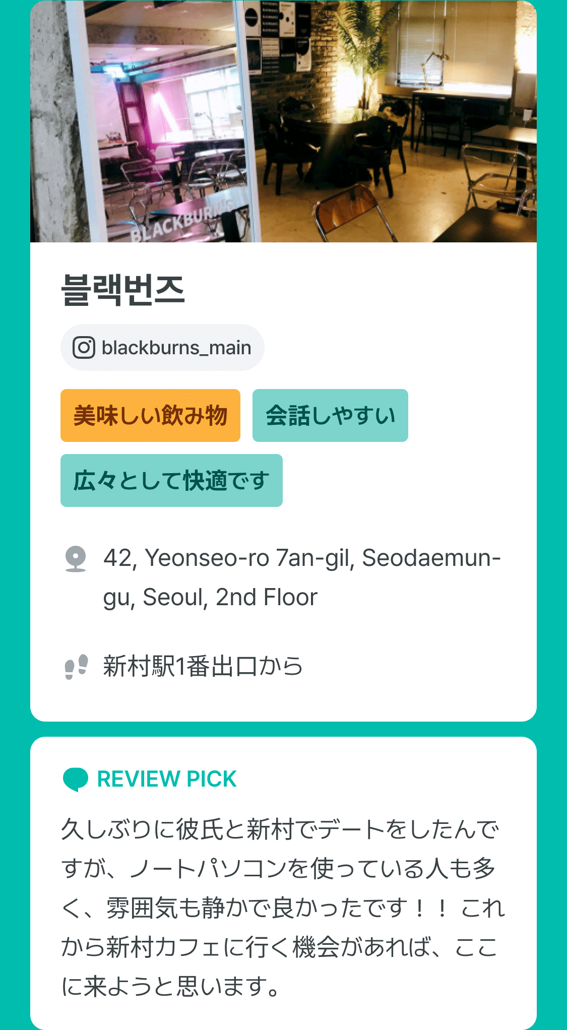 「ネイバーマップ」では、現在の地図画面を基準に周辺のレストランやカフェを簡単に見つけることができる機能を提供しています。