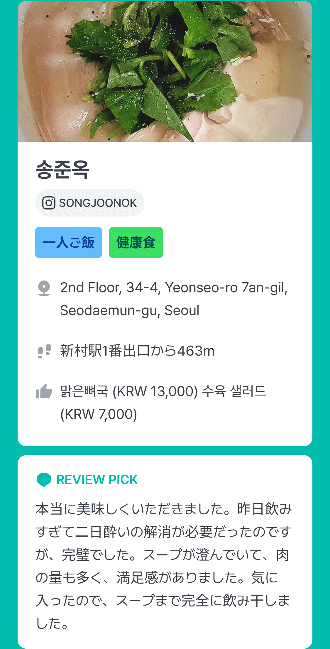 「レストラン」ボタンを押すと、検索結果に該当する企業の位置が表示され、その下の画面を上にスワイプすると詳細なリストを見ることができます。各店舗の結果と、実際に店舗を訪れたお客様が残したレビューを確認することができ、非常に便利です。