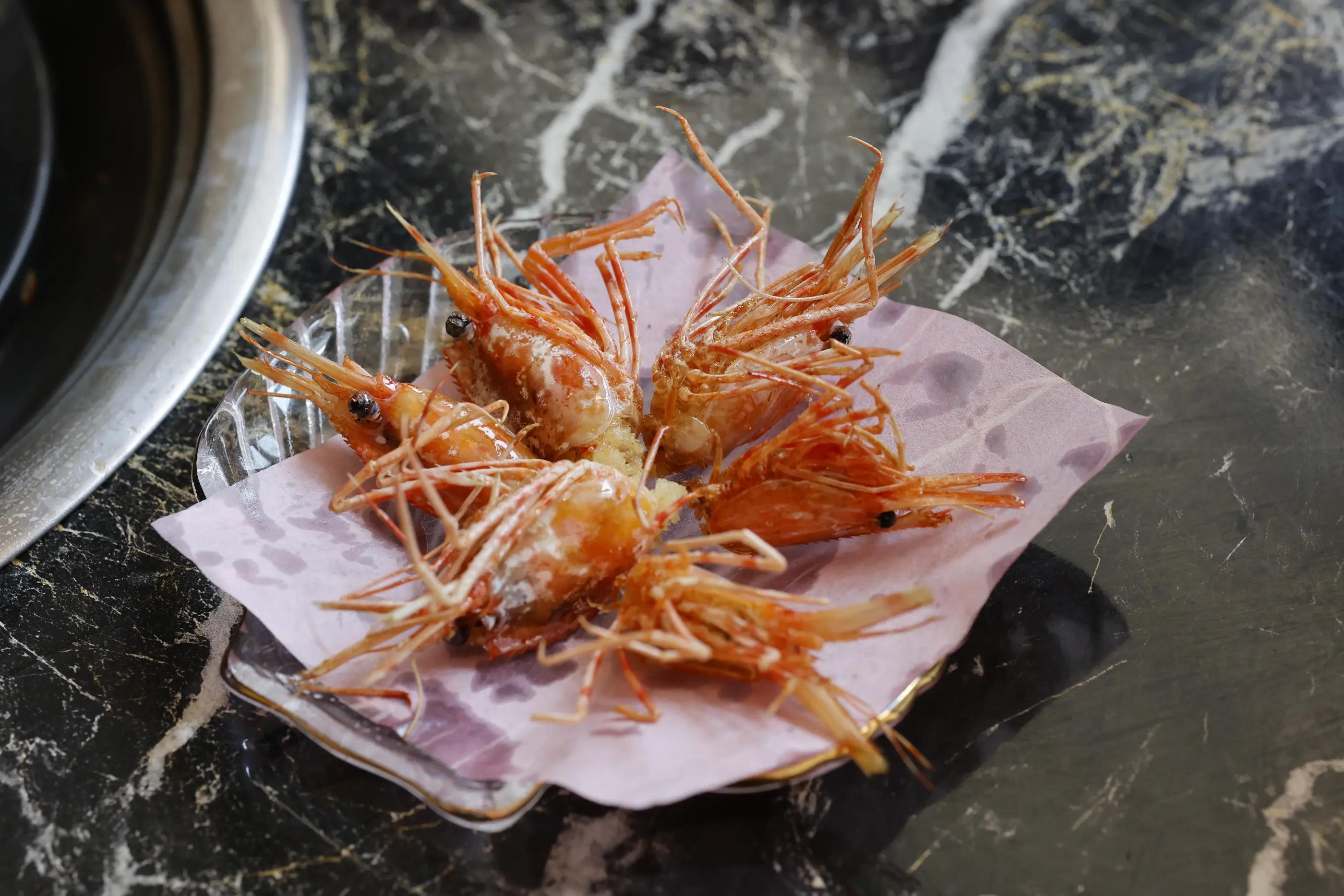 独島エビの頭は、食べ終わった後に集めておくと、このようにカリッと揚げて提供してくれます。香ばしさと旨みが凝縮された一品で、ぜひ味わっていただきたい特別な楽しみのひとつです。