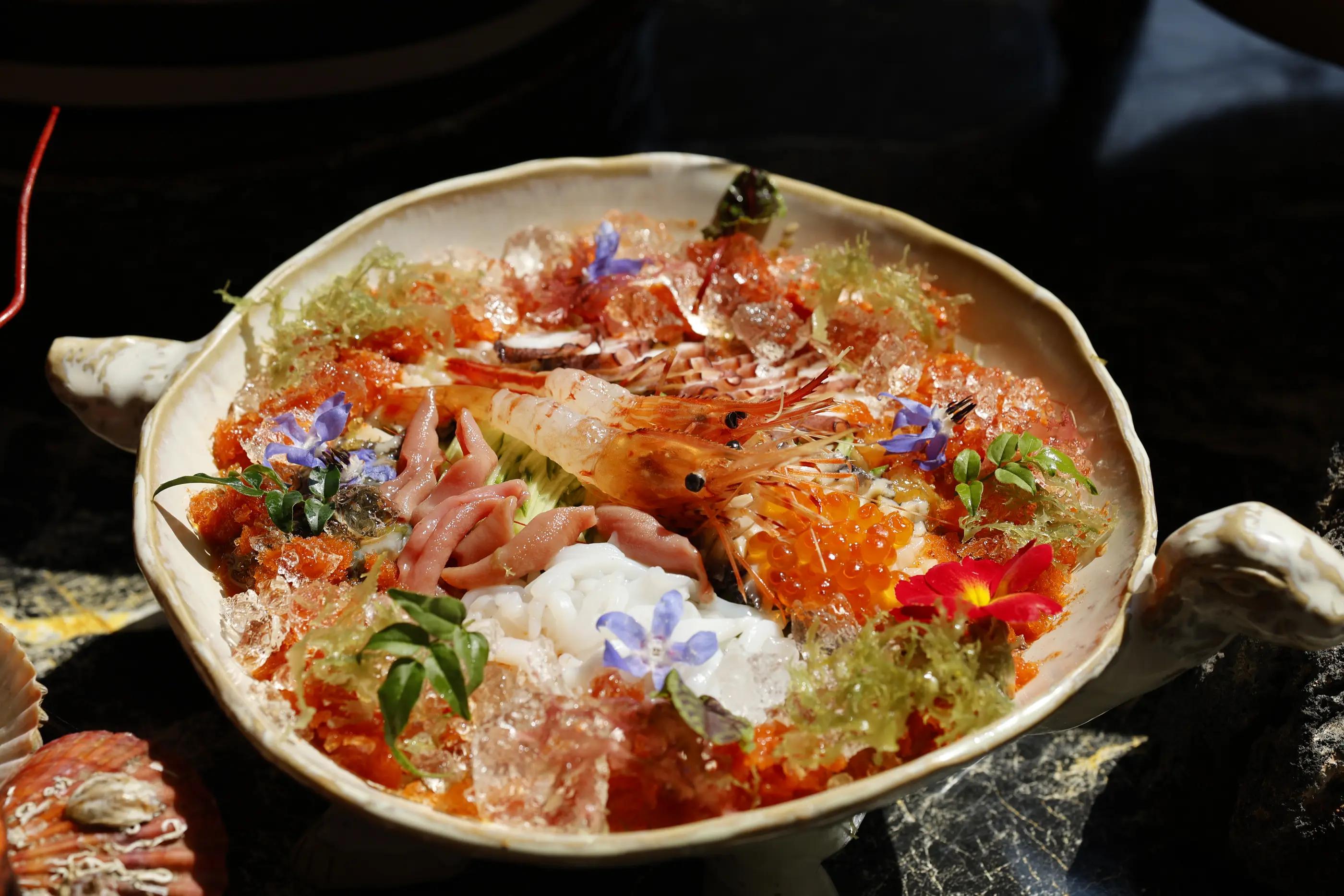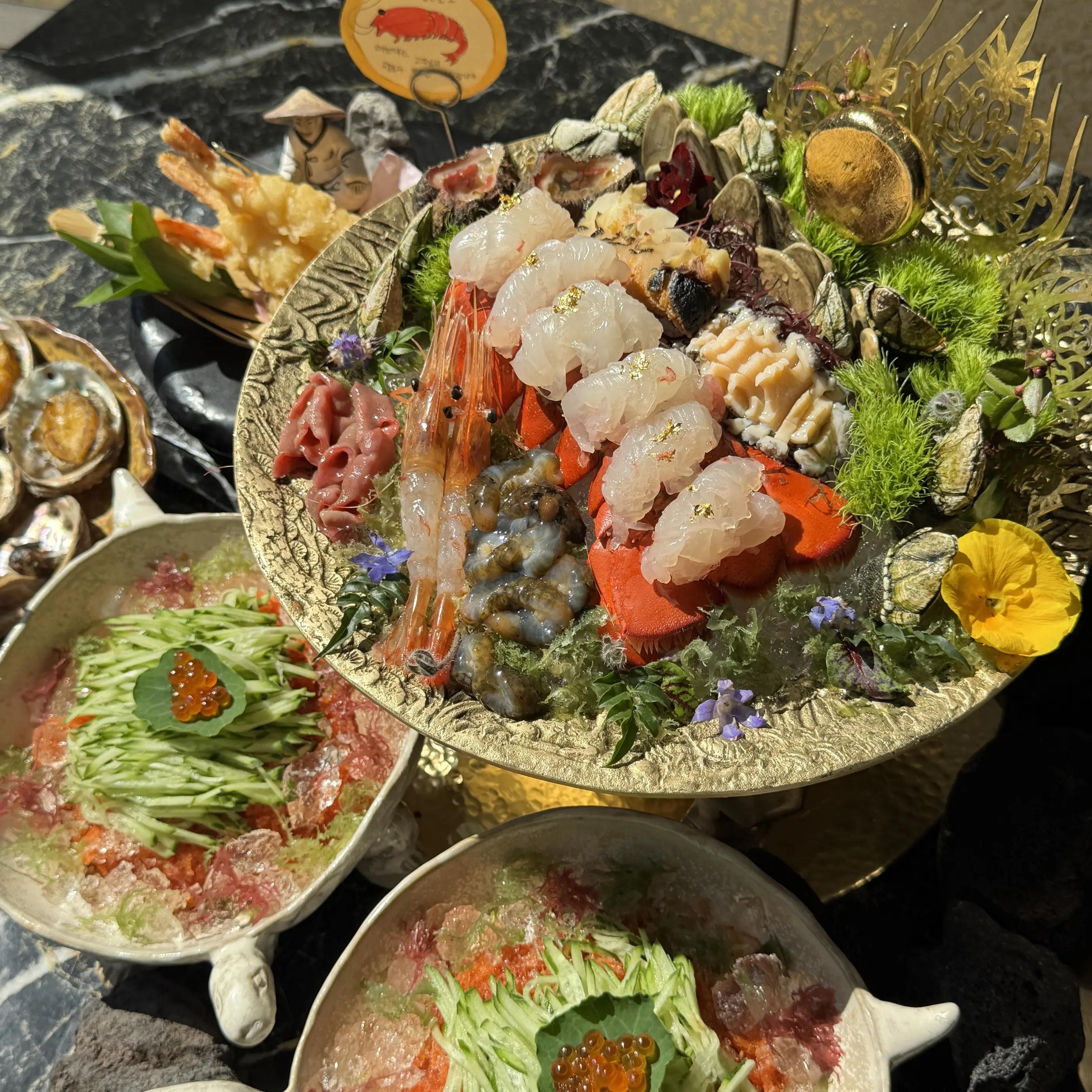 このコースでは、ロブスターの頭部は最初に提供された後に再び取り、バターグリルで調理され、尾は新鮮なロブスター刺身で提供されます。タコのチョムチム、ゲブル、ウニ、タコ、ユッケ、メモガイ、ナマコなど、さまざまな海産物も含まれています。