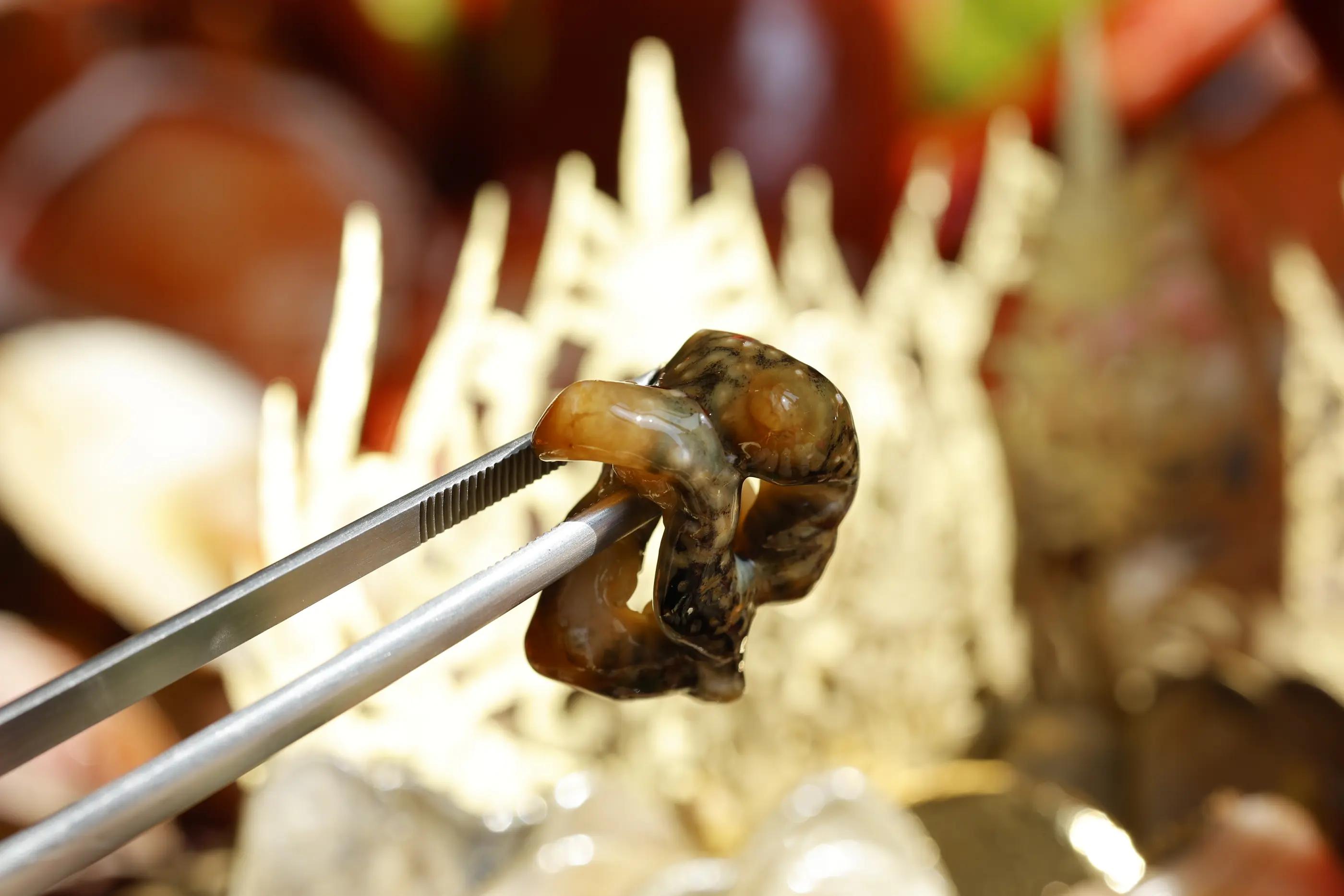 次にいただいたのは、マグロの刺身、亀の手、ナマコ、そして独島エビ。いずれも韓国でも高級とされる貴重な海産物ばかりです。