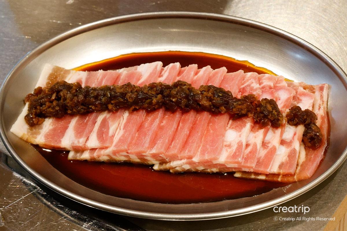 醤油サムギョプサルは甘じょっぱい味わいで、味はヤンニョムカルビに似ています。タレをかけて焼くので、しっとりと食感がさらに柔らかくなります。