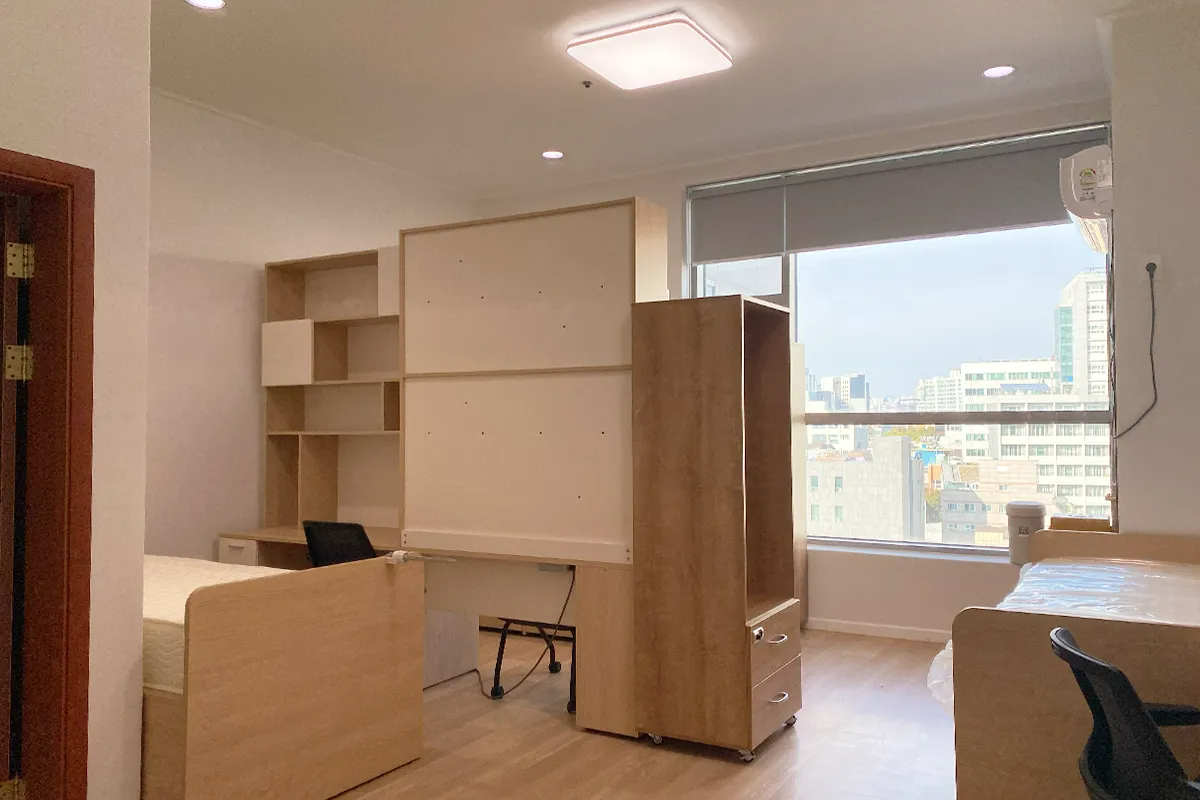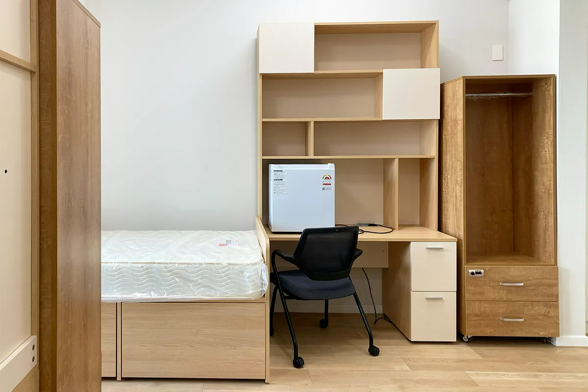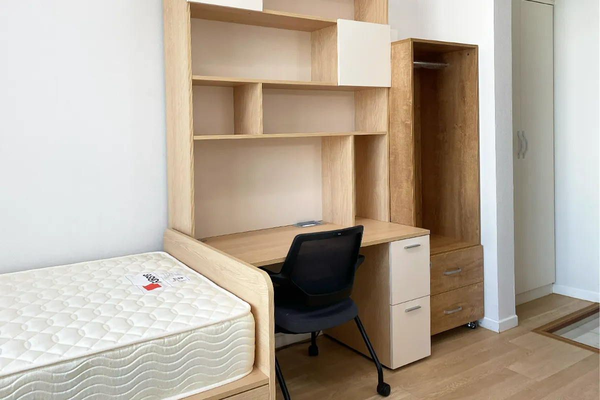 部屋には机とタンス、ベッドの下の引き出し等多様な収納施設があり、学生たちの住居のニーズを満たすことができる十分な収納空間を提供しています。
