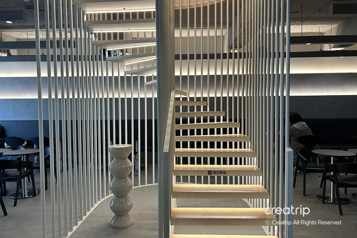 ほのかな照明がついていて、まるで芸術作品のような螺旋形の階段を通って2階に上がることができます。