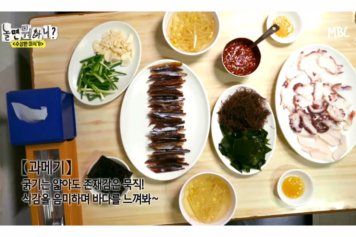 松重さんが食べたクァメギはサンマを独特な方法で干した干物で、昆布やエゴノリ、秘法ソースと一緒に海苔に巻いて食べます!