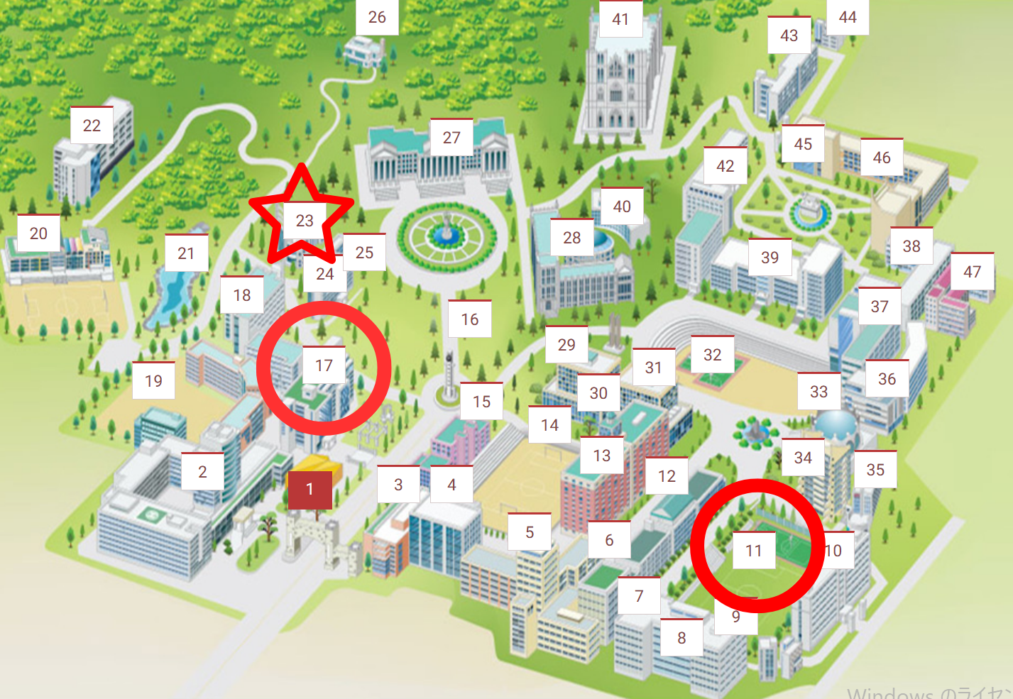 赤い星マーク(23番)が語学堂のある国際教育院なので、場所的に一番近い17番の青雲館にある学食に行くことが多いと思います。ただ、歩いてみるとそこまで遠くないので、学食のメニューを見てからどちらの学食に行くのか決めるのをオススメします