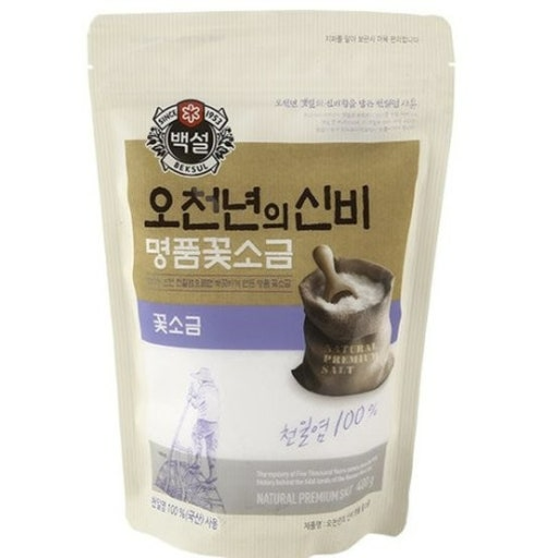 | 꽃소금 (コッソグム) | ![]() | 「花のように細かい塩」という意味で、粒がとても細かい。 精製塩よりもややミネラル分が多い。 | 仕上げの味付け、サラダや和え物 |